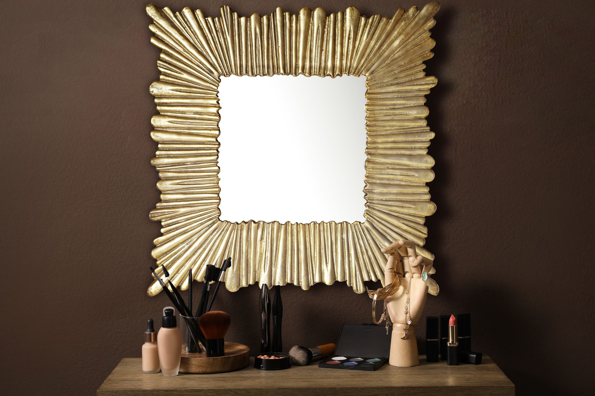 To kwadratowe lustro ścienne o wymiarach 75x75 cm posiada złotą aluminiową ramę z wzorem promieni słonecznych. Tafla lustra o wymiarach 37 x 37 cm, oprawiona w dynamiczne relief, dodaje jasności i nowoczesnego charakteru każdemu wnętrzu.