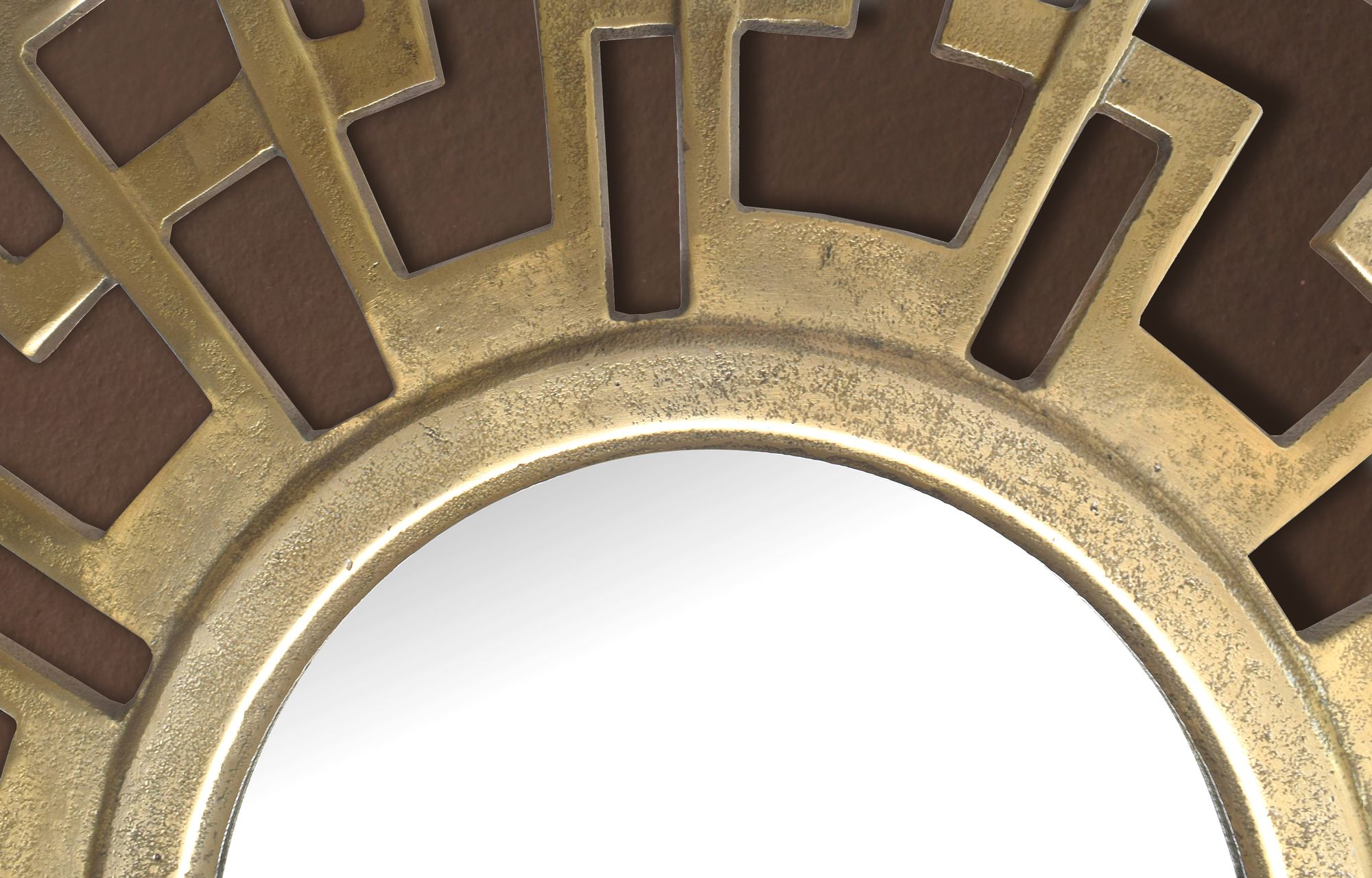 Dodaj elegancki akcent Art déco do swojego wnętrza dzięki temu okrągłemu lustrze ściennemu o średnicy 60 cm. Złota rama z aluminium z geometrycznym wzorem idealnie otacza taflę lustra o średnicy 24 cm, oferując nowoczesny i wyrafinowany design, idealny do salonu, przedpokoju czy sypialni.