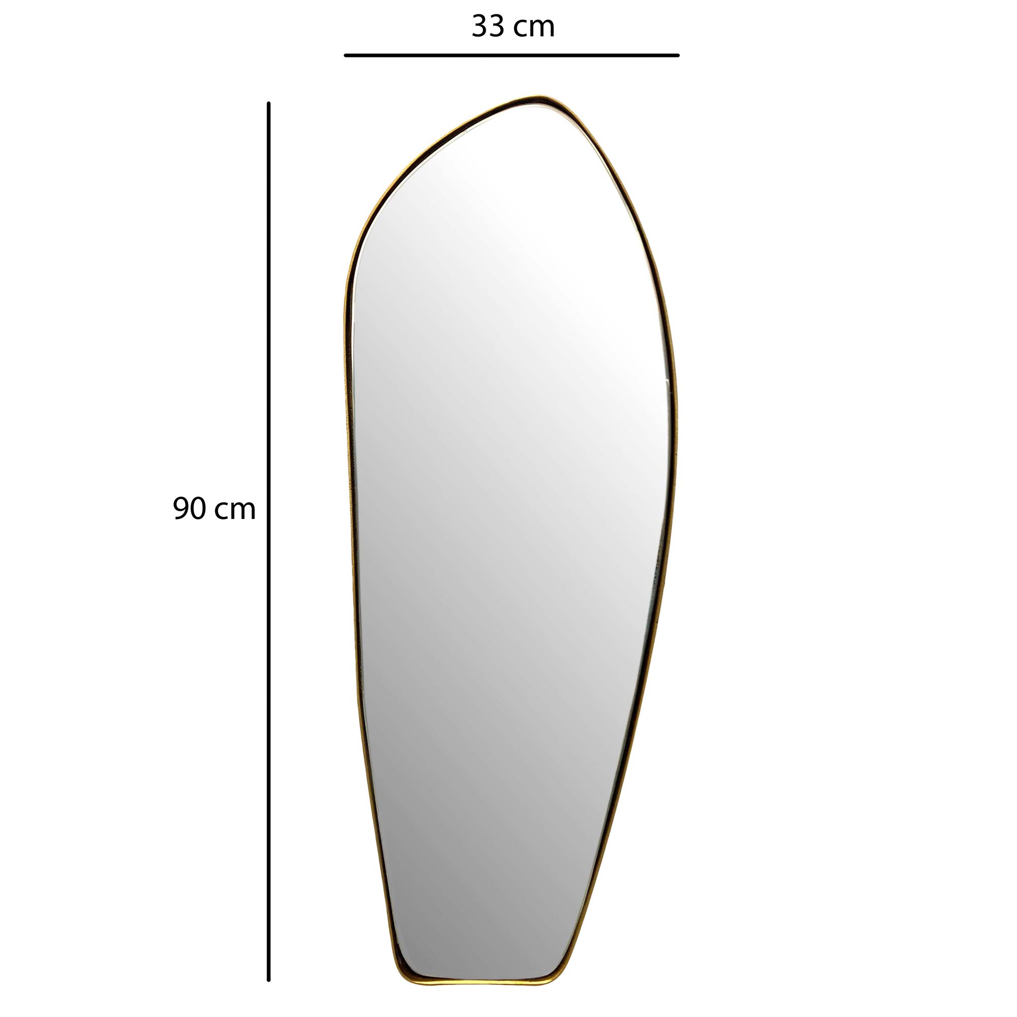 Dodaj nowoczesny i niepowtarzalny akcent do swojego wnętrza dzięki temu asymetrycznemu lustrze ściennemu z metalową, złotą ramą. Nieregularny kształt i ręczne wykonanie zapewniają wyjątkowy element dekoracyjny pasujący do różnych pomieszczeń.