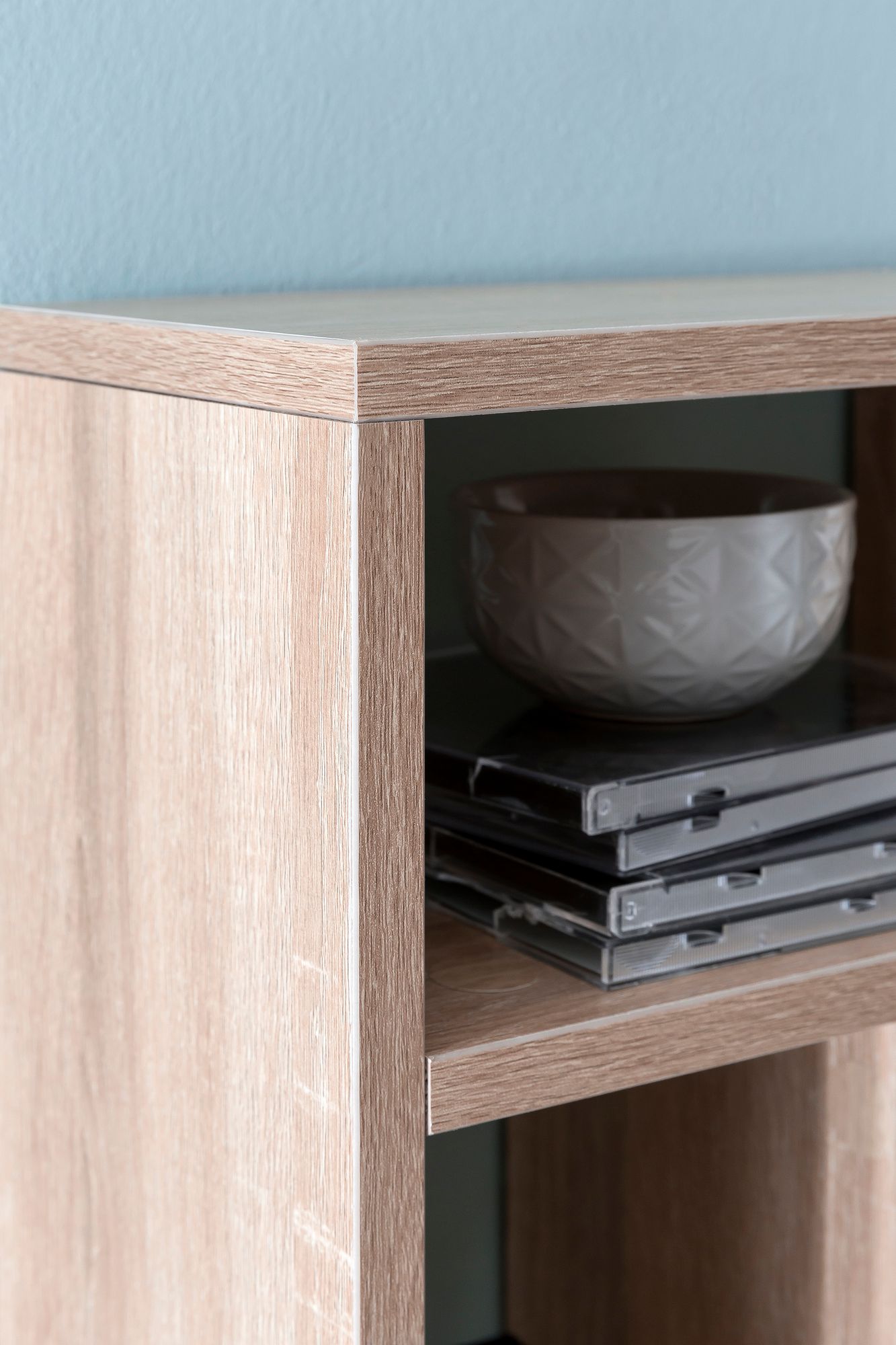 Ta nowoczesna półka ścienna w kolorze Sonoma dąb łączy stylowy design z funkcjonalnością. Wykonana z płyty wiórowej pokrytej melaminą, posiada twardą, odporną na zarysowania i wodoodporną powierzchnię, łatwą do utrzymania w czystości.