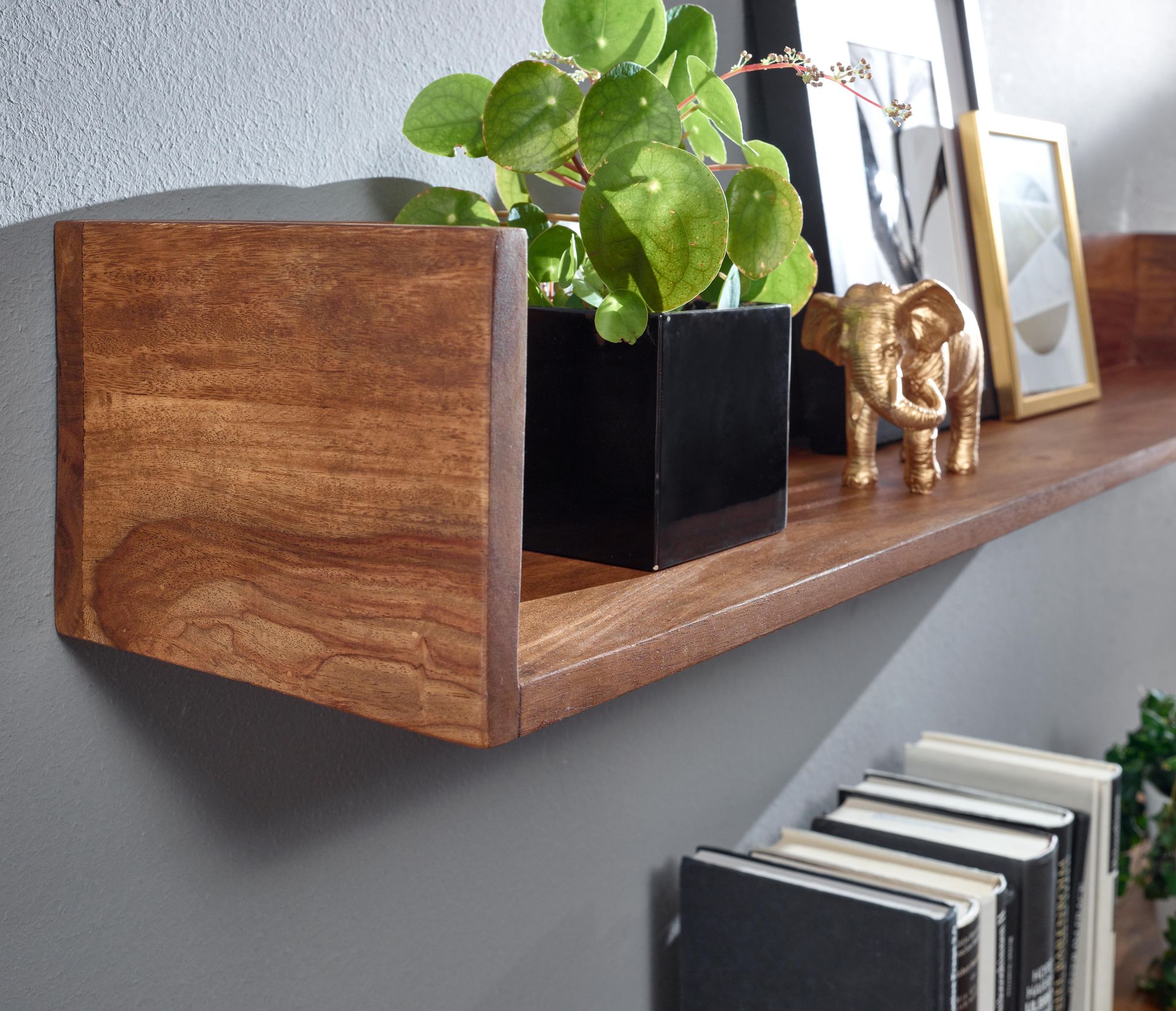 Ta półka ścienna wykonana z litego drewna Sheesham łączy elegancję z praktycznością. Brązowe wykończenie i nowoczesny, unoszący się design pasują do każdego wnętrza.