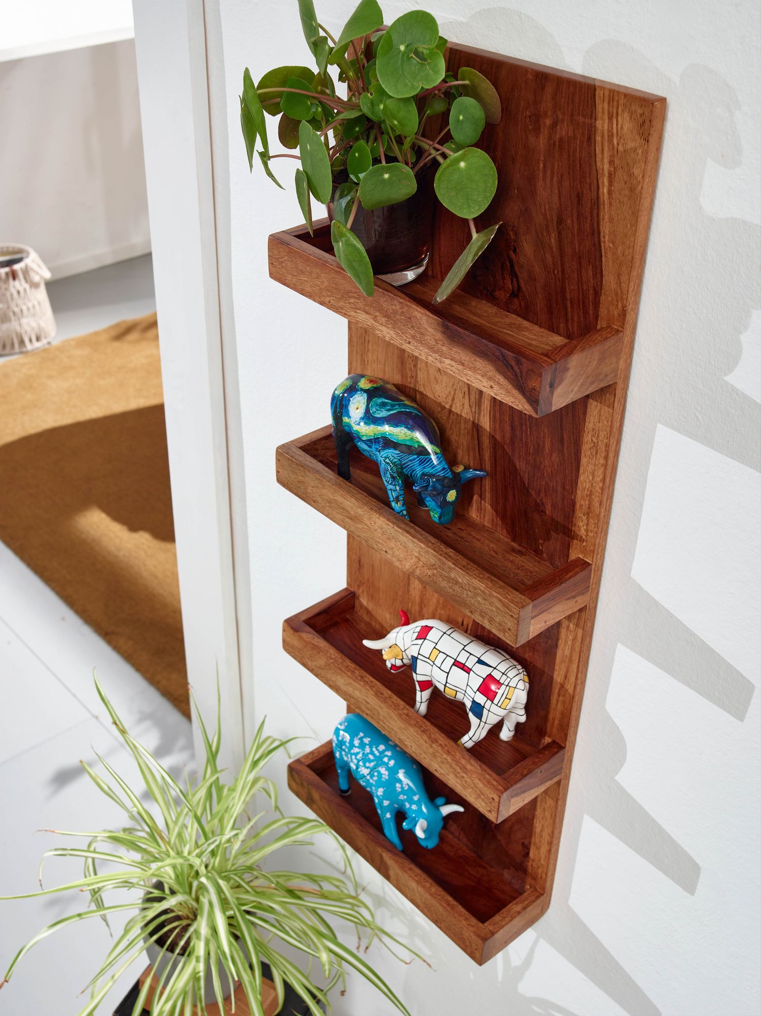 Ta półka ścienna z litego drewna Sheesham wnosi naturalny akcent do wnętrza dzięki prostemu designowi i czterem praktycznym półkom. Ciemnobrązowe wykończenie podkreśla piękne usłojenie drewna.