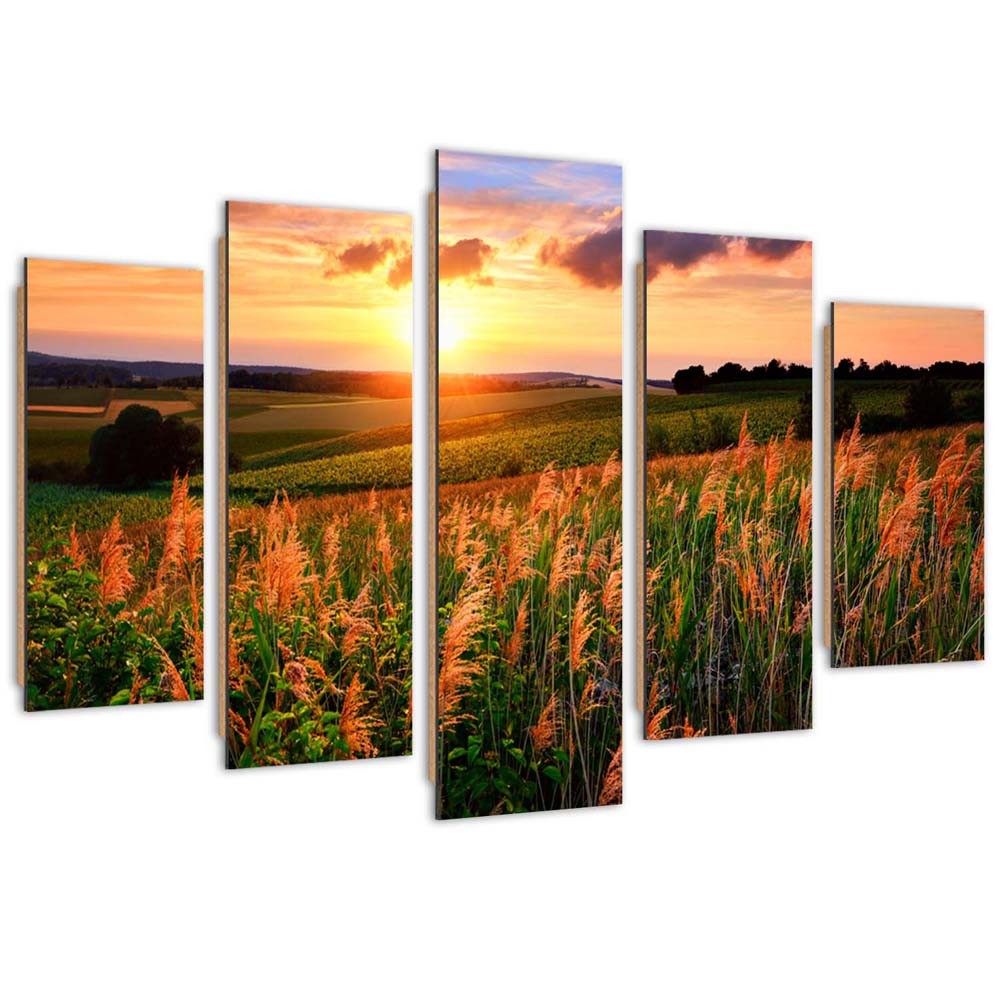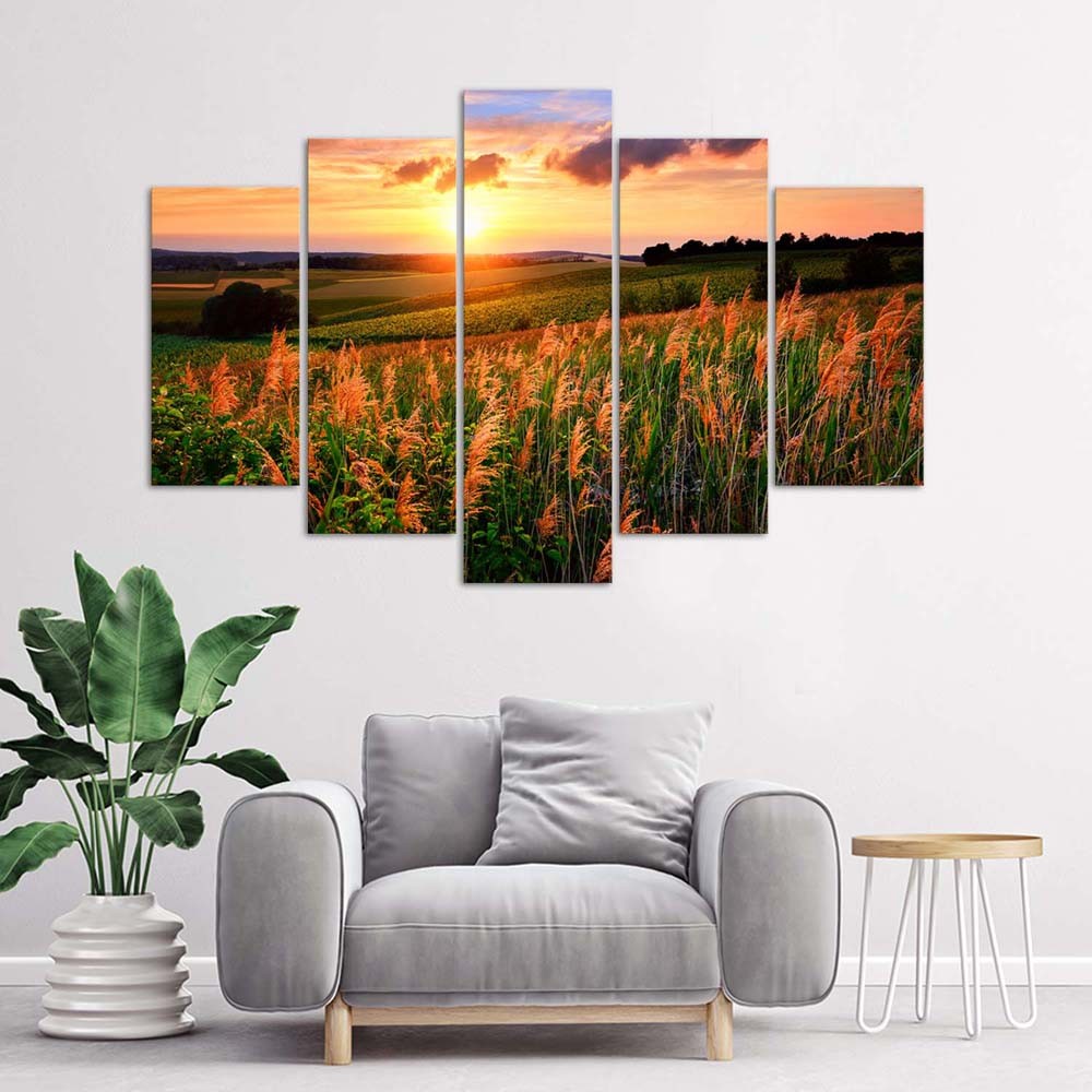- Ramka złożona z pięciu części „Zachód słońca na łące” wydrukowanych na płótnie MDF (włókno średniej gęstości).