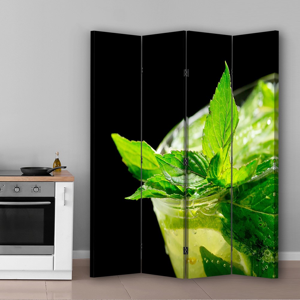 Opis i cechy - Parawan z wizerunkiem kieliszka z orzeźwiającą miętą wykonany z płyty MDF i płótna