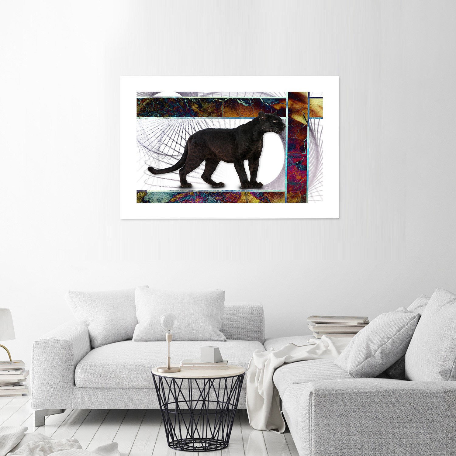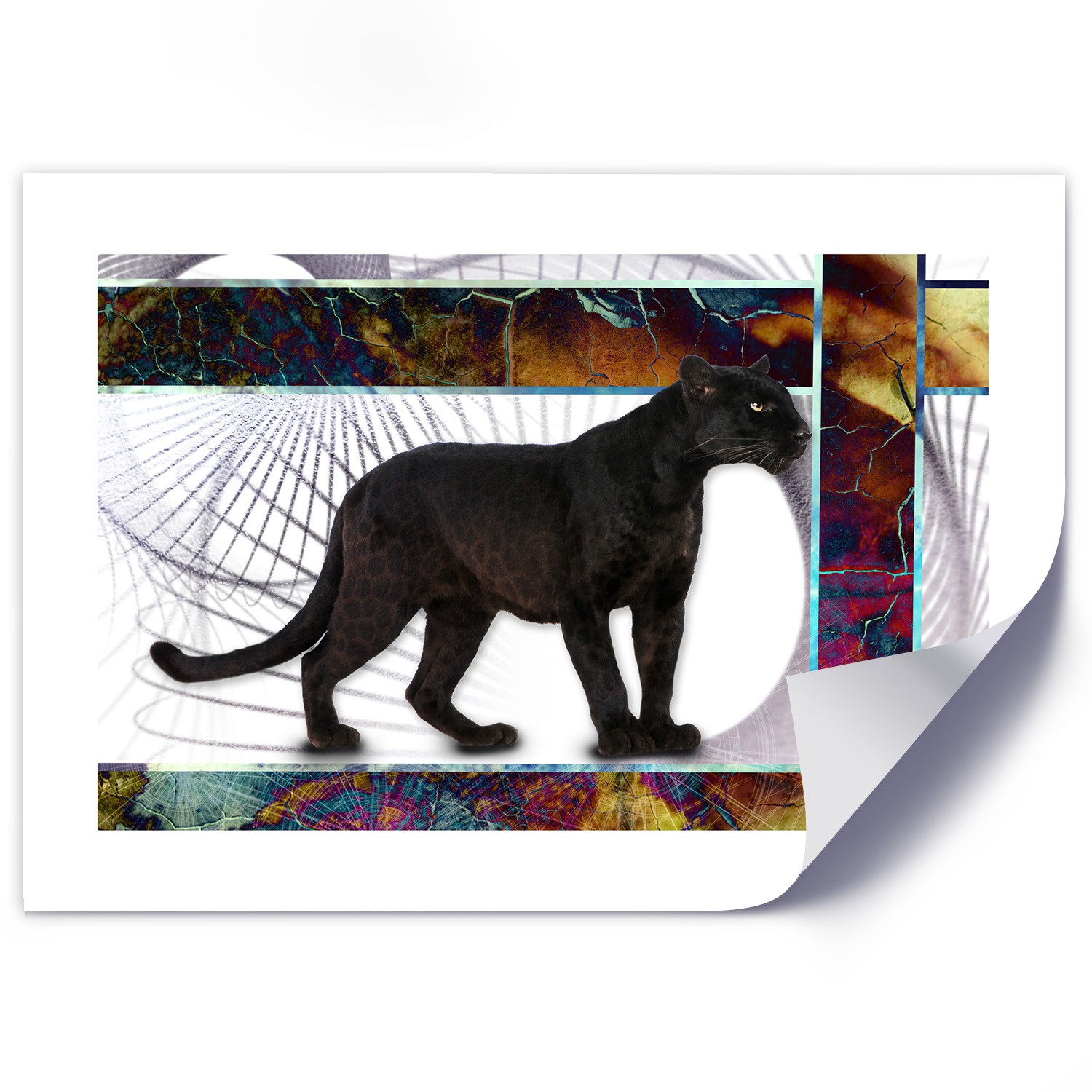 Papierowy plakat na ścianę z wizerunkiem czarnej pantery i wielobarwnymi figurami geometrycznymi