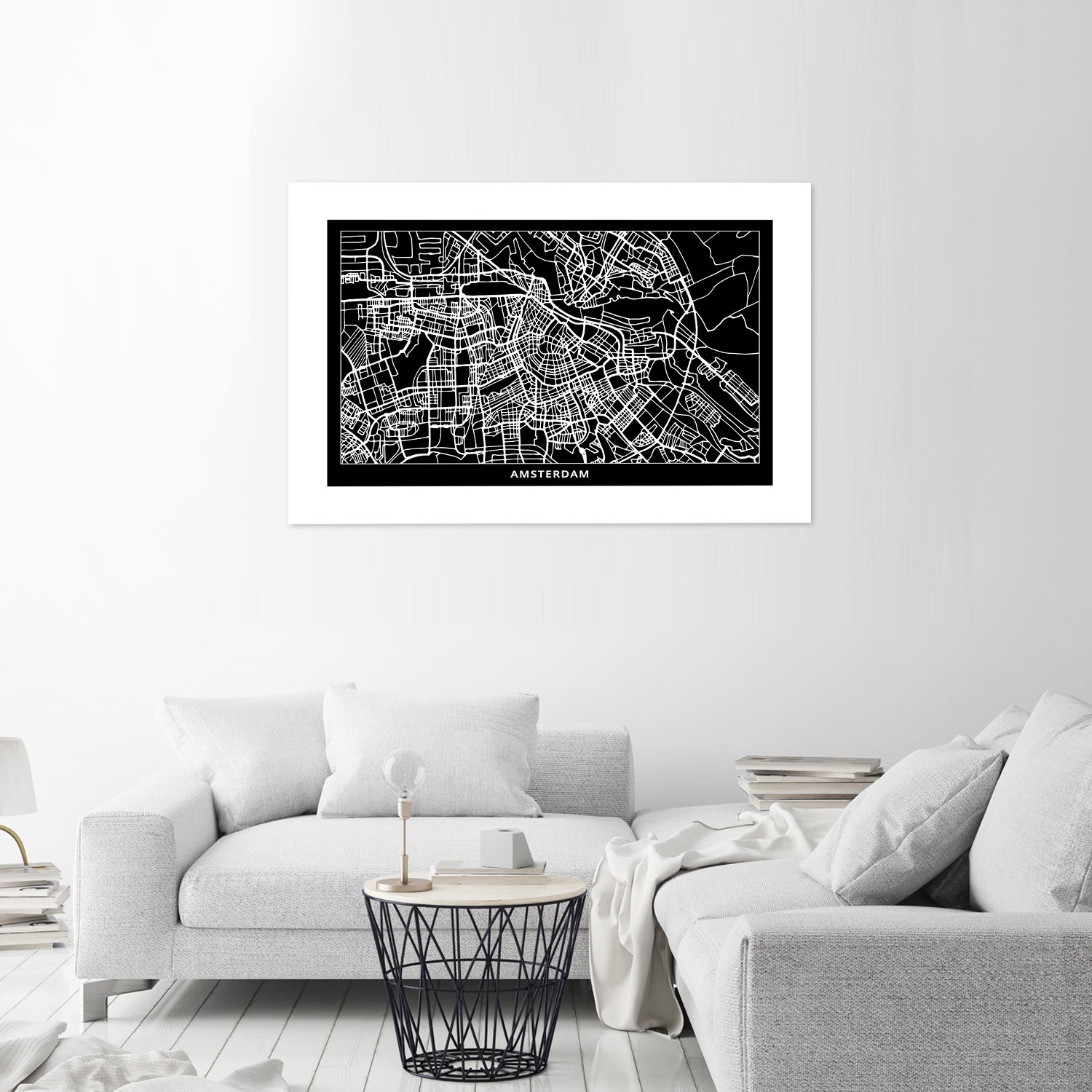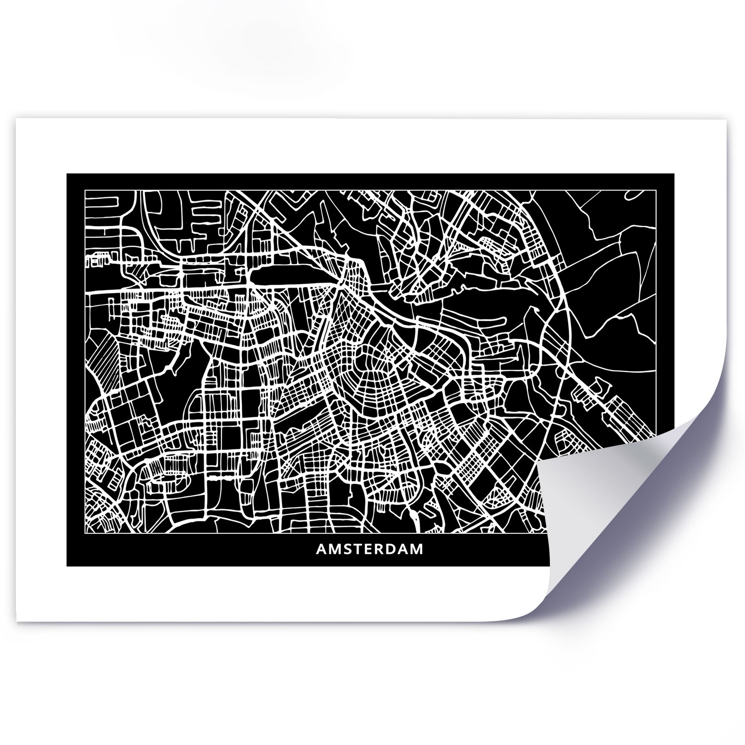 Papierowy plakat na ścianę z wizerunkiem czarno-białej mapy amsterdamu