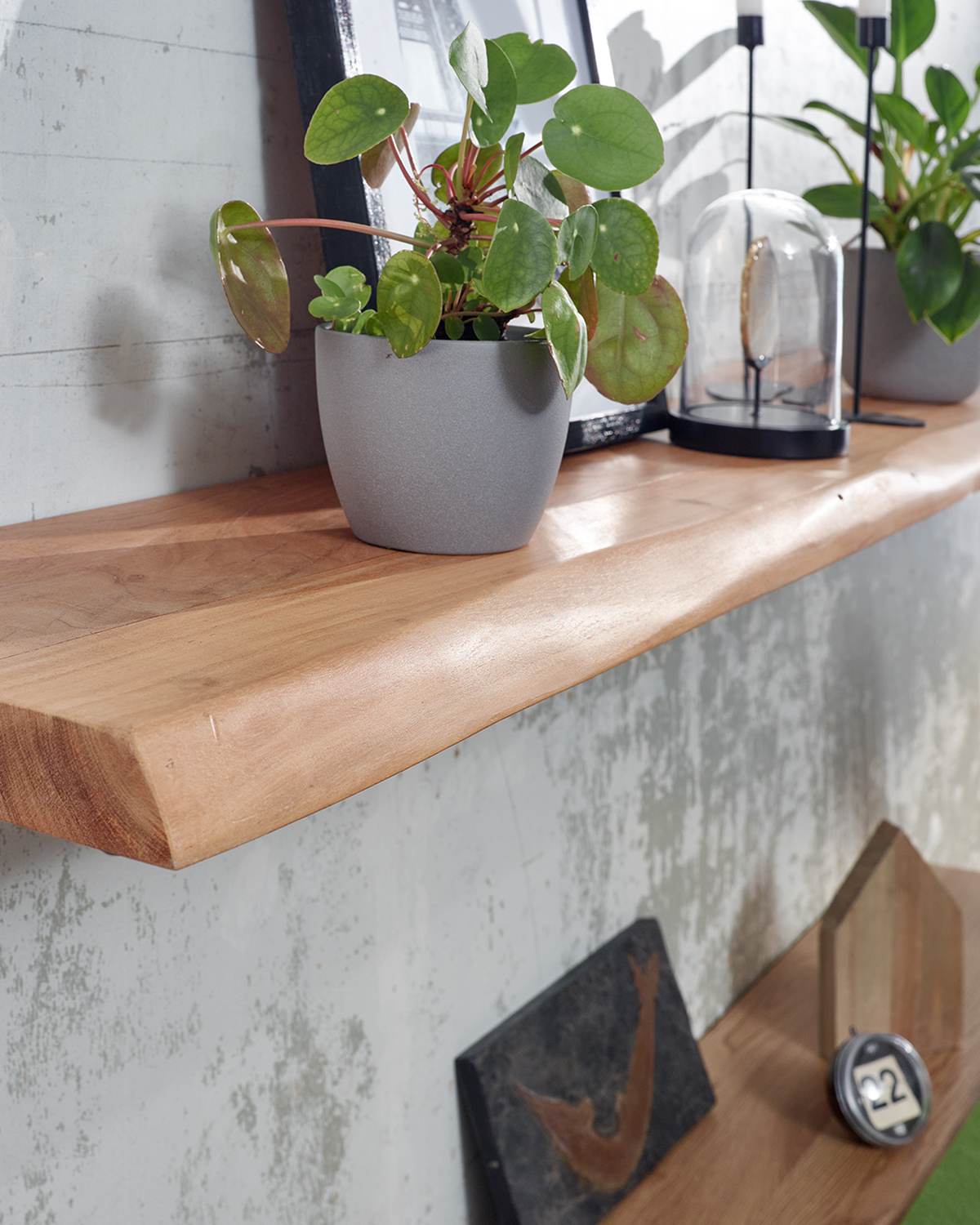 This solid acacia wood wall shelf features a natural edge and rustic finish, highlighting the wood’s authentic texture with a protective clear lacquer coating.