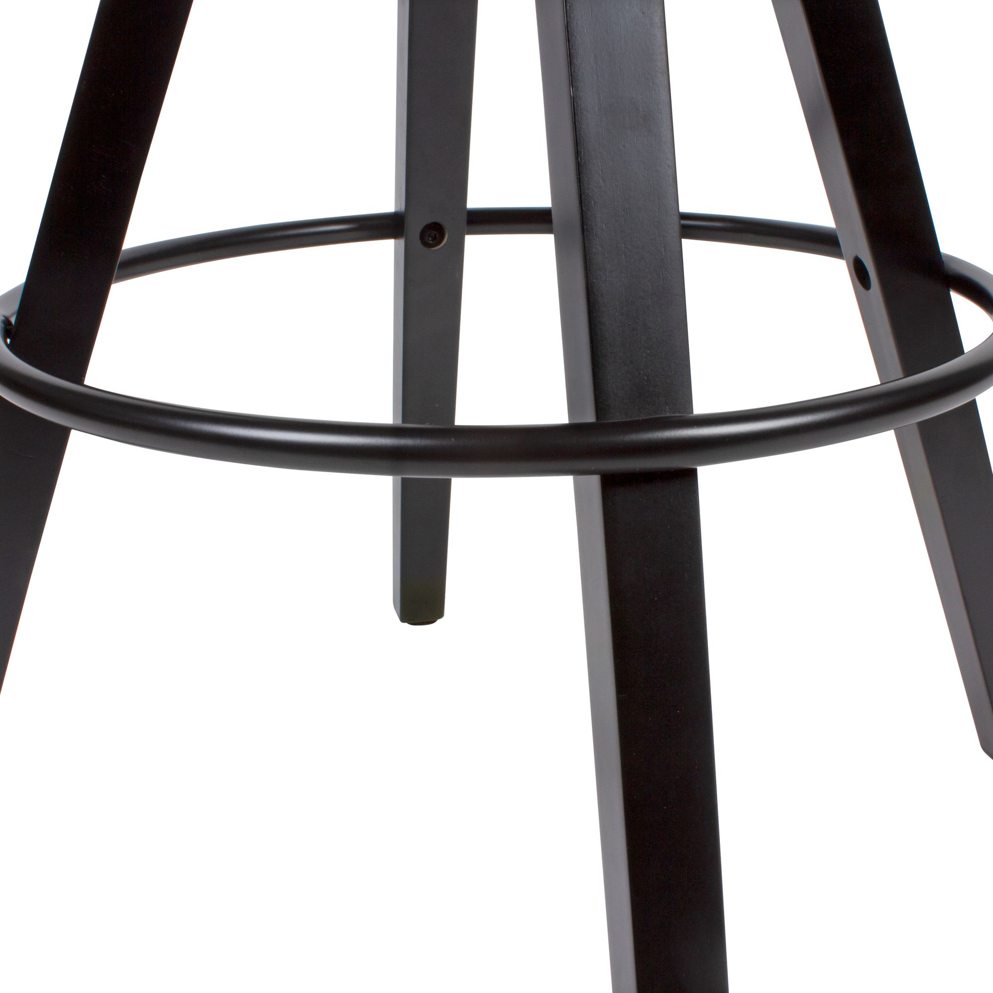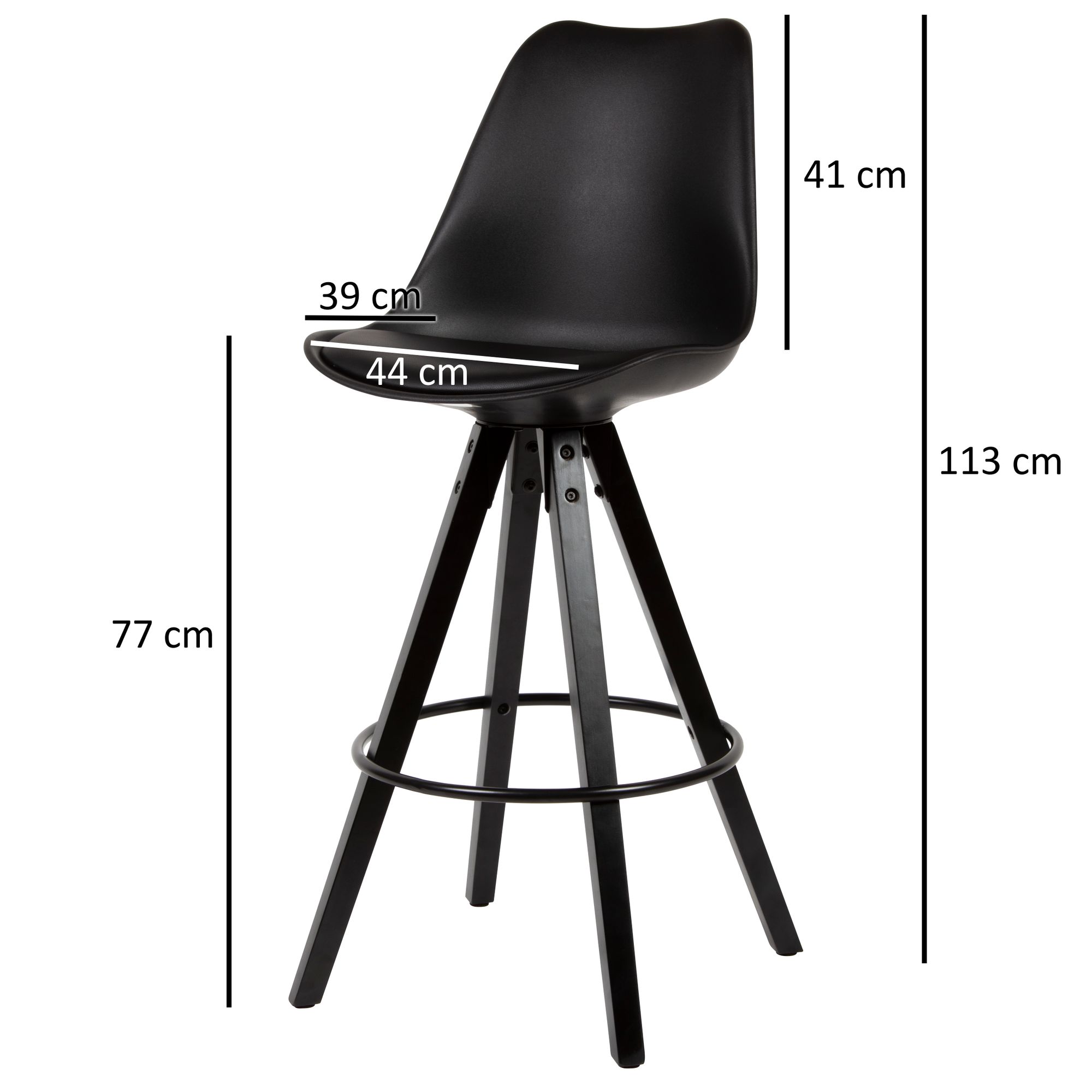 Add a modern touch to your bar with this 2-piece set of black bar stools in Scandinavian design. The generously padded seat and backrest are upholstered in faux leather for superior comfort. Solid black lacquered Hevea wood legs are complemented by a metal ring footrest at 30 cm height. Outward-angled legs provide firm stability, and felt glides prevent floor scratches.
