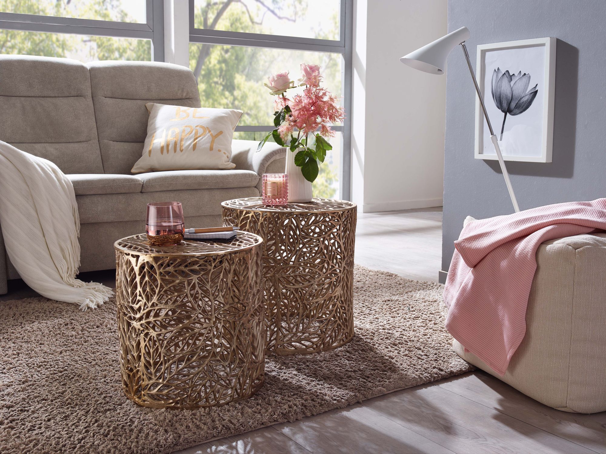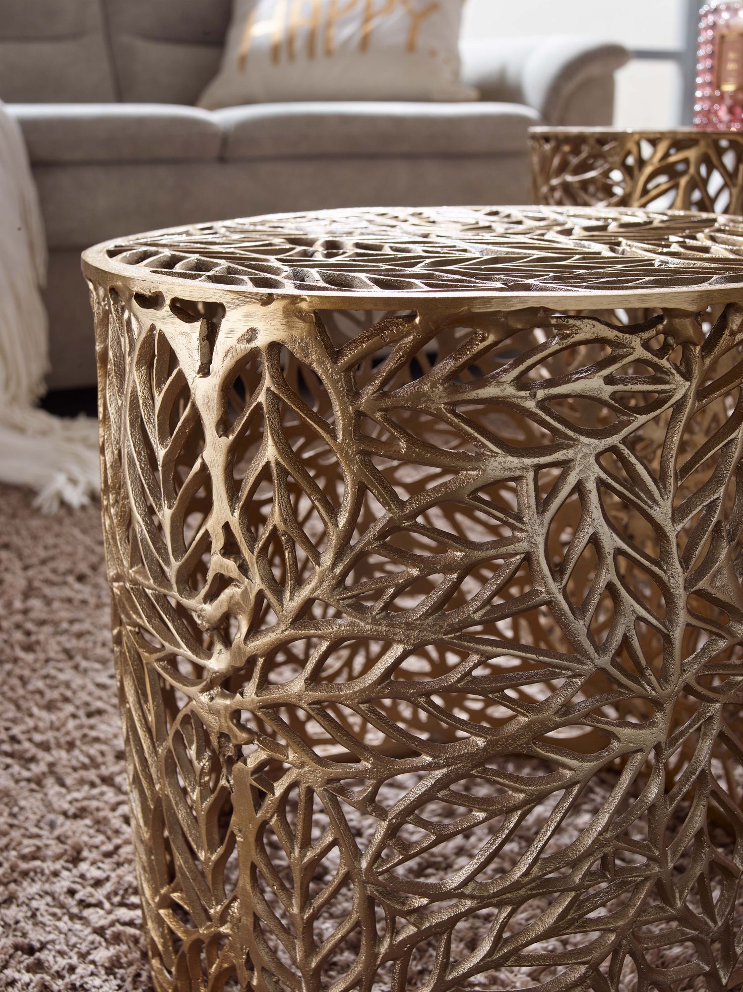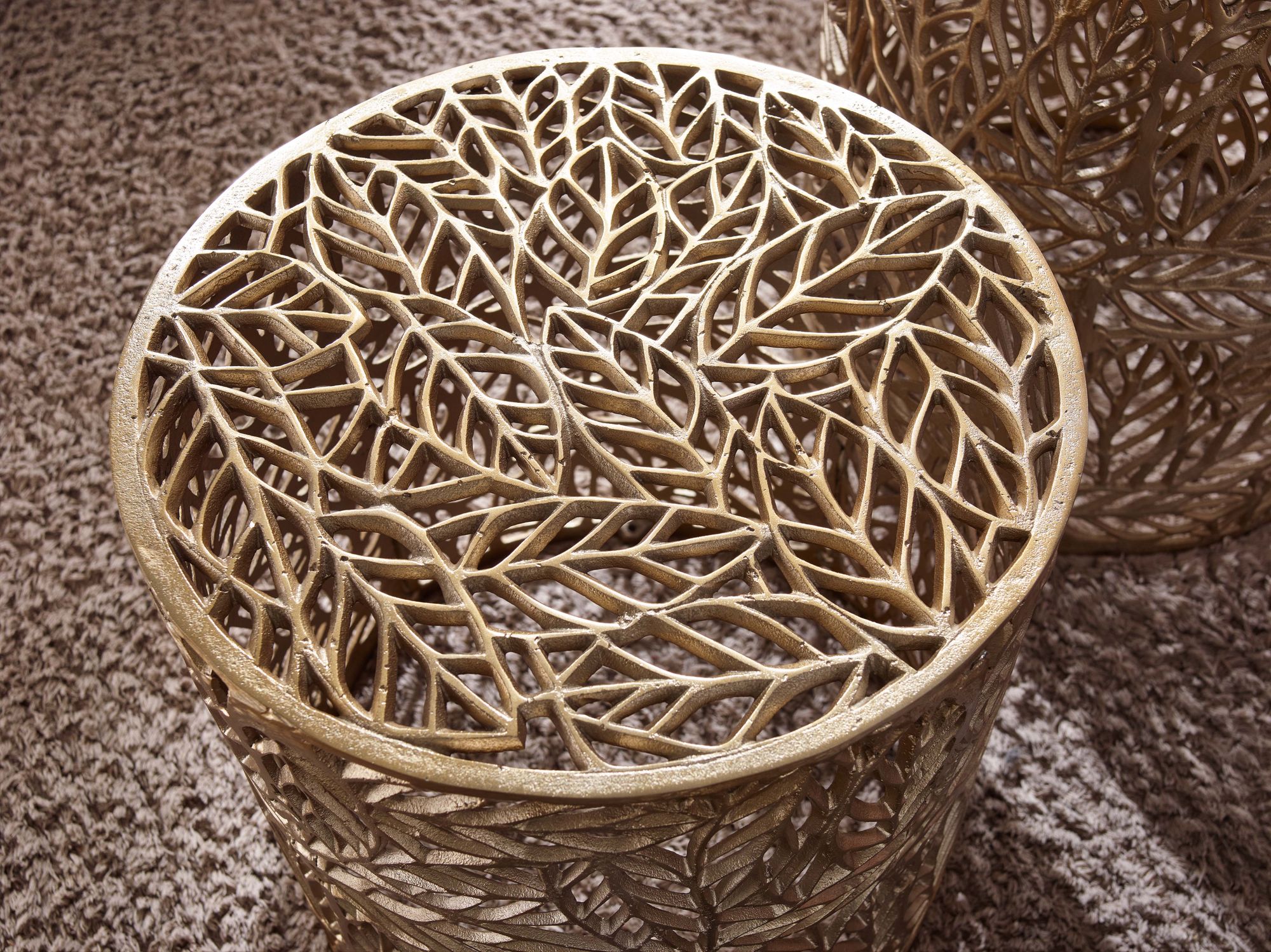 Choose this 2-piece gold aluminum side table set combining elegance and practicality. Each table features intricate floral metalwork, providing a modern and stylish accent to any living space.