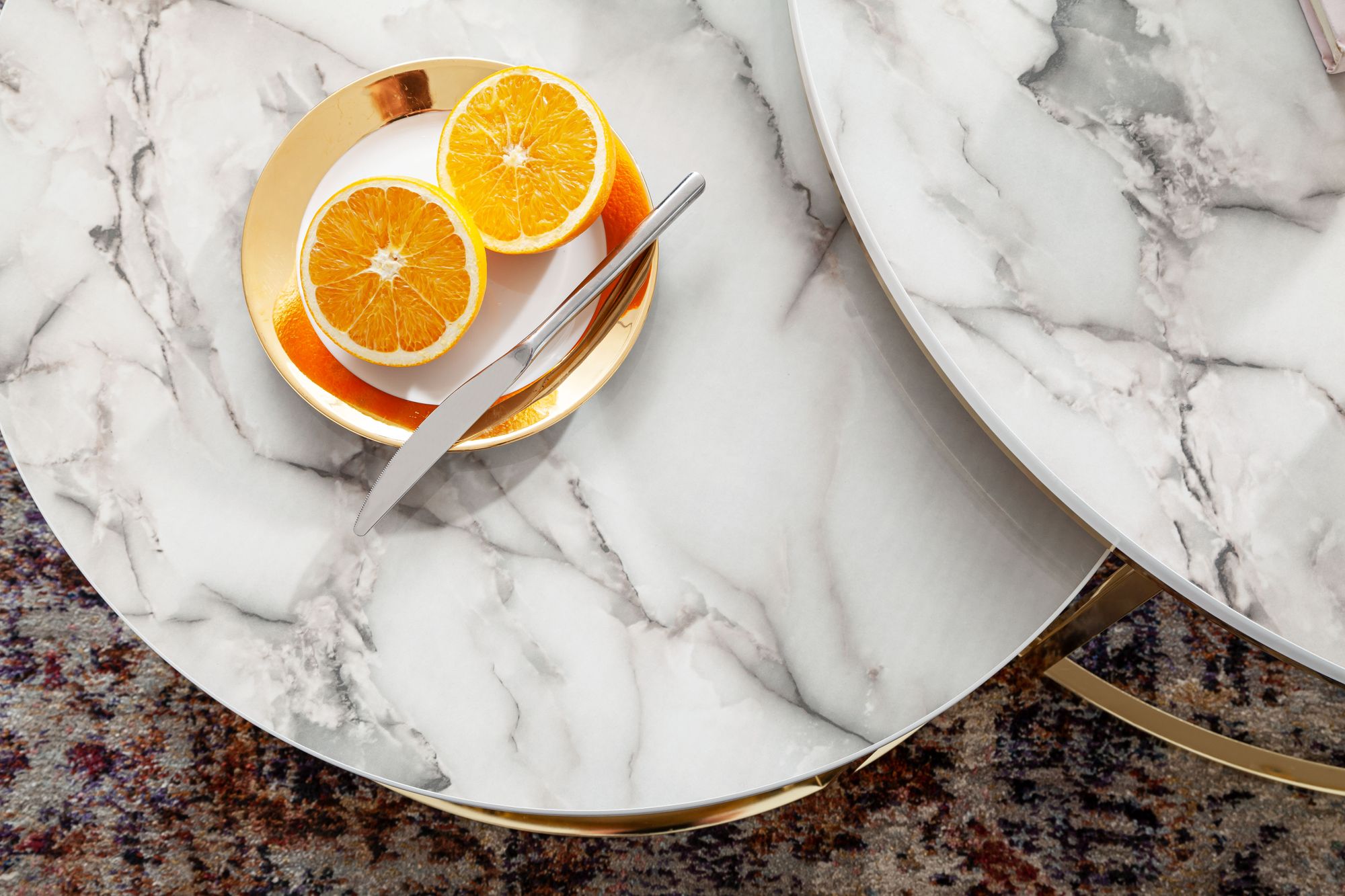 - Color: White marble gloss tabletops, shiny gold frames