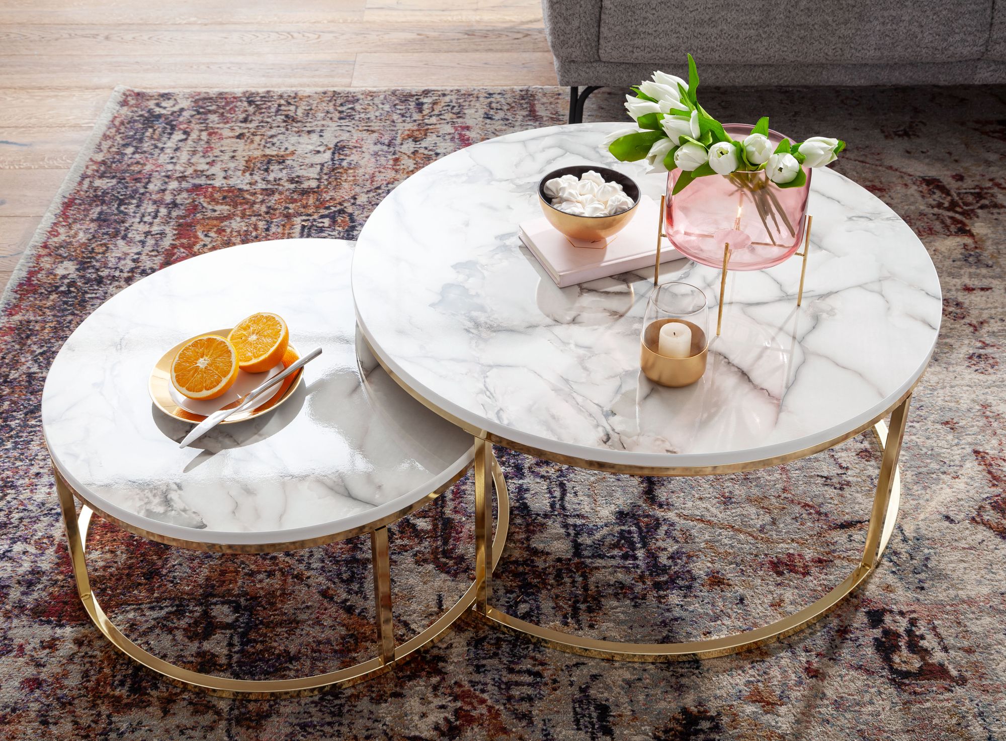 Add elegance and practicality to your living room with this set of two modern round coffee tables. The white high-gloss marble-look laminated MDF tabletops with polyresin coating rest on shiny gold metal frames.