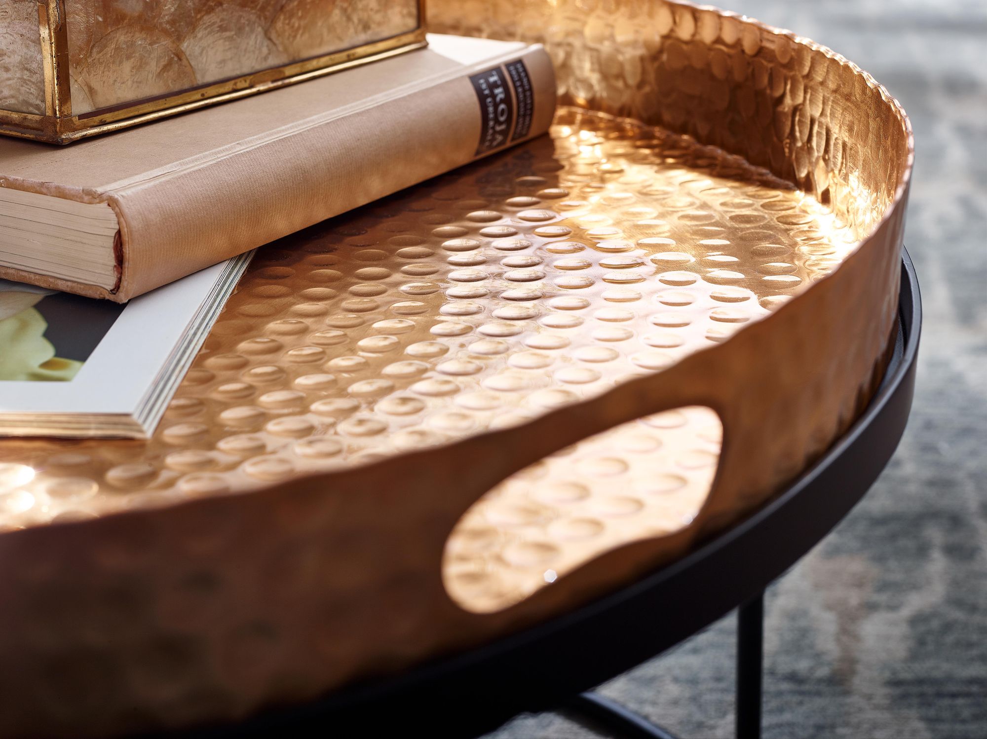 Elevate your living room style with this 2-piece round coffee table set in gold and black metal. The gold lacquered aluminum tops feature a hammered texture for a refined contemporary look. Black steel frames offer strength and long-lasting durability.