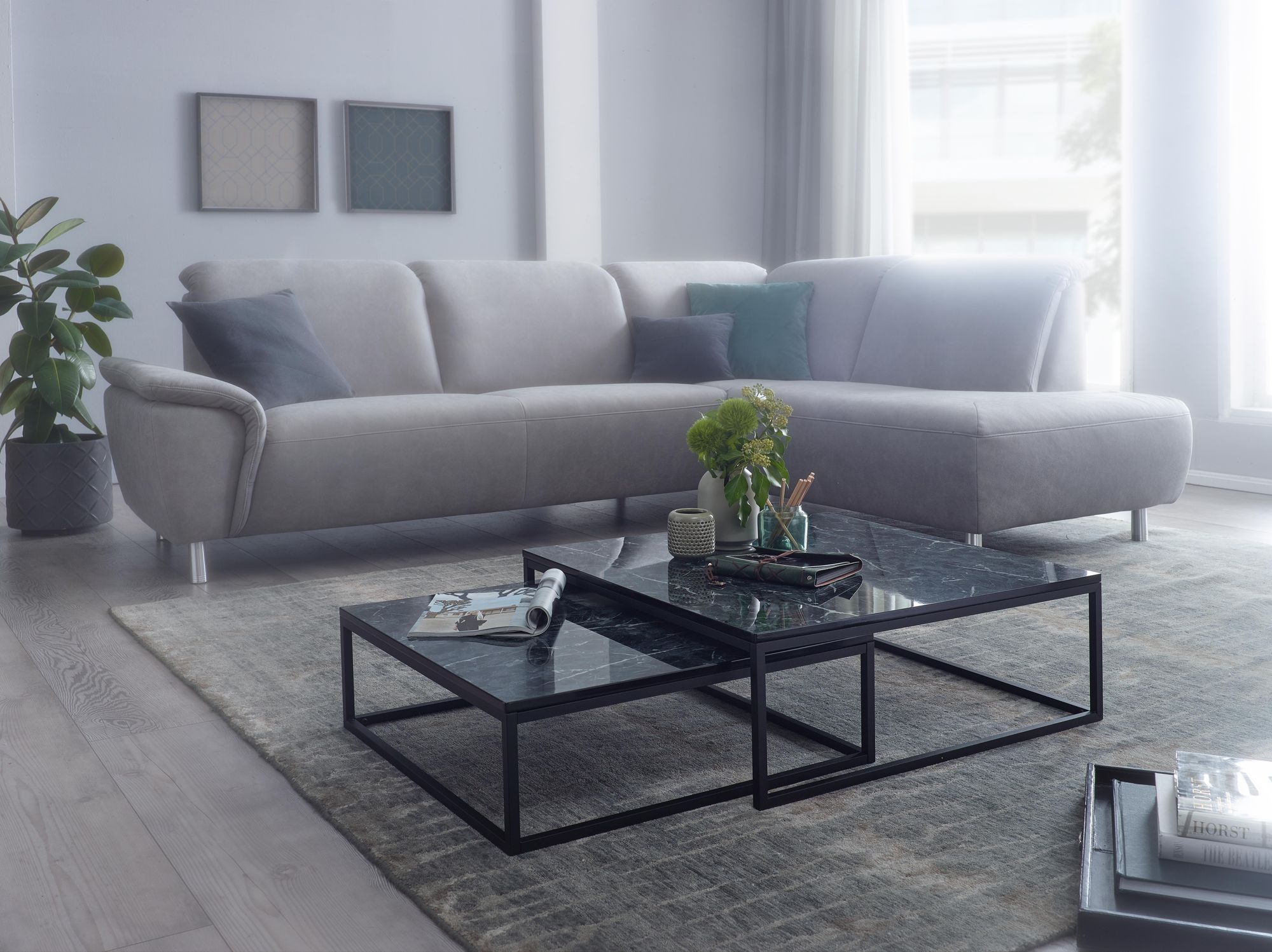 This modern set of two square coffee tables adds a sophisticated touch to your interior. The black high-gloss marble-effect MDF tops create an elegant style, supported by sturdy matte black metal frames.