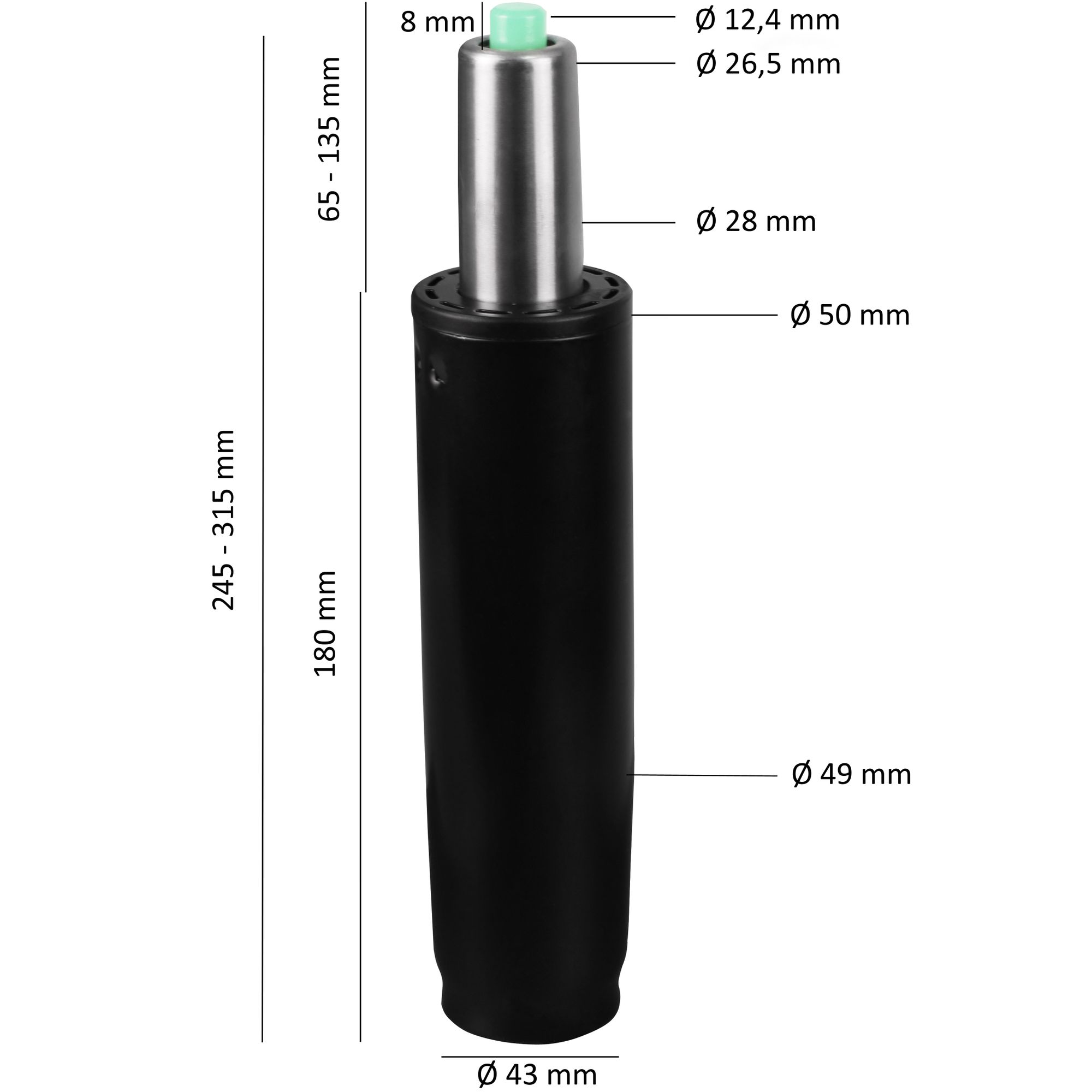 Height adjustment range is 245 to 315 mm, with an effective stroke of 65-135 mm and a main body height of 180 mm. The upper piston diameter is 26.5 mm, lower 28 mm, and the central body diameter is 50 mm, ideal for bases with 50 mm holes.