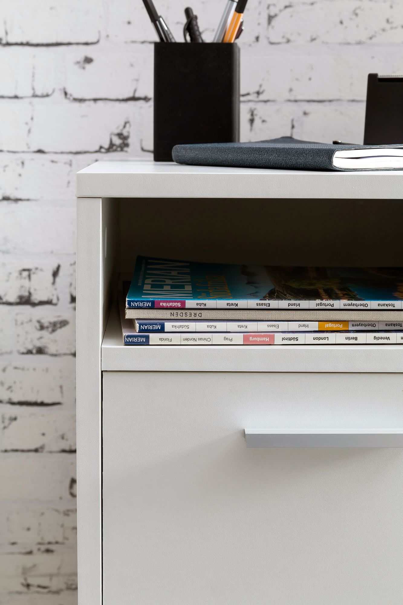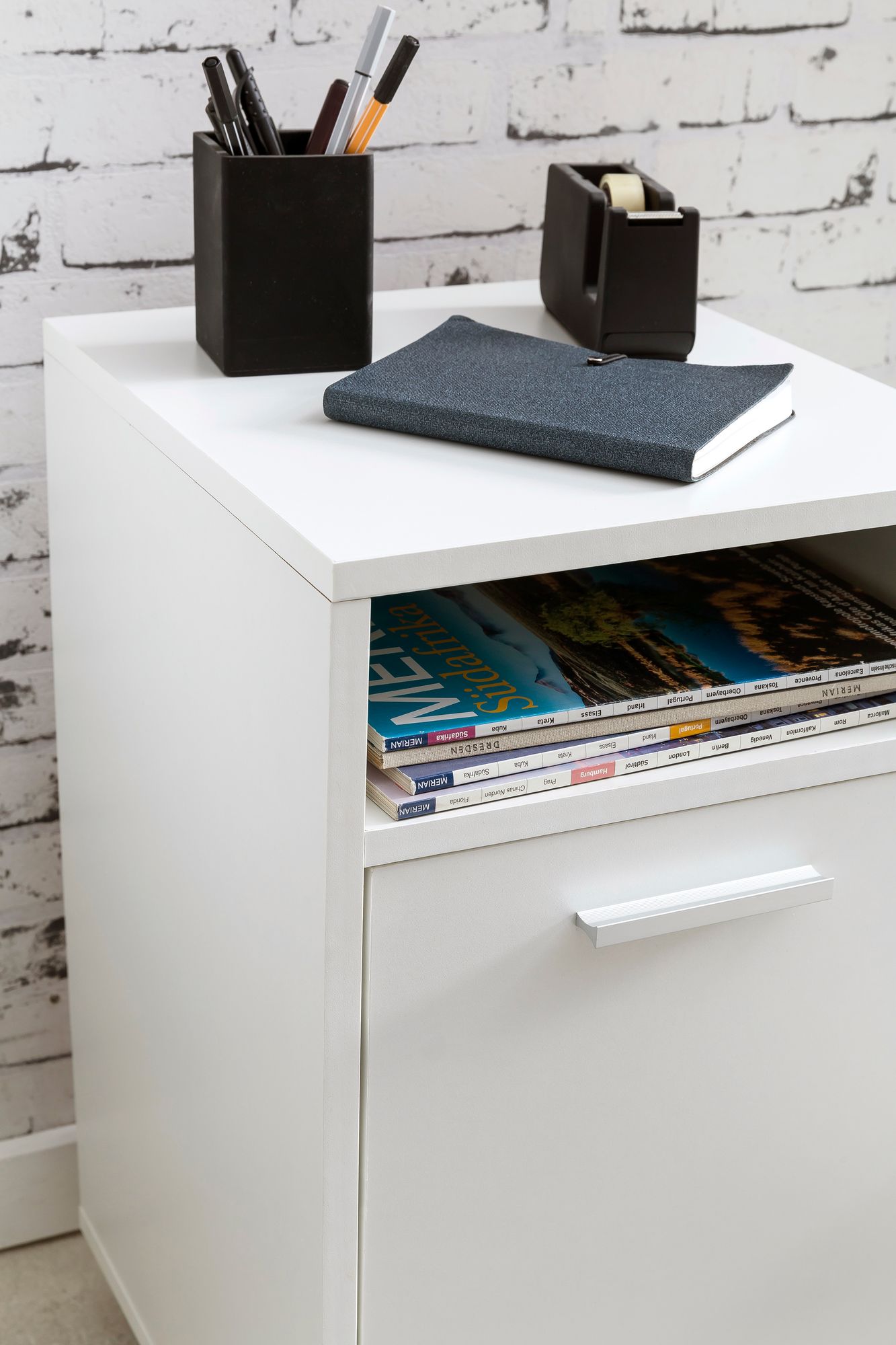 Ten biały kontener na rolkach wykonany z płyty wiórowej to praktyczne i mobilne rozwiązanie do organizacji miejsca pracy. Ponadczasowy design z czystymi liniami idealnie pasuje pod lub obok biurka.