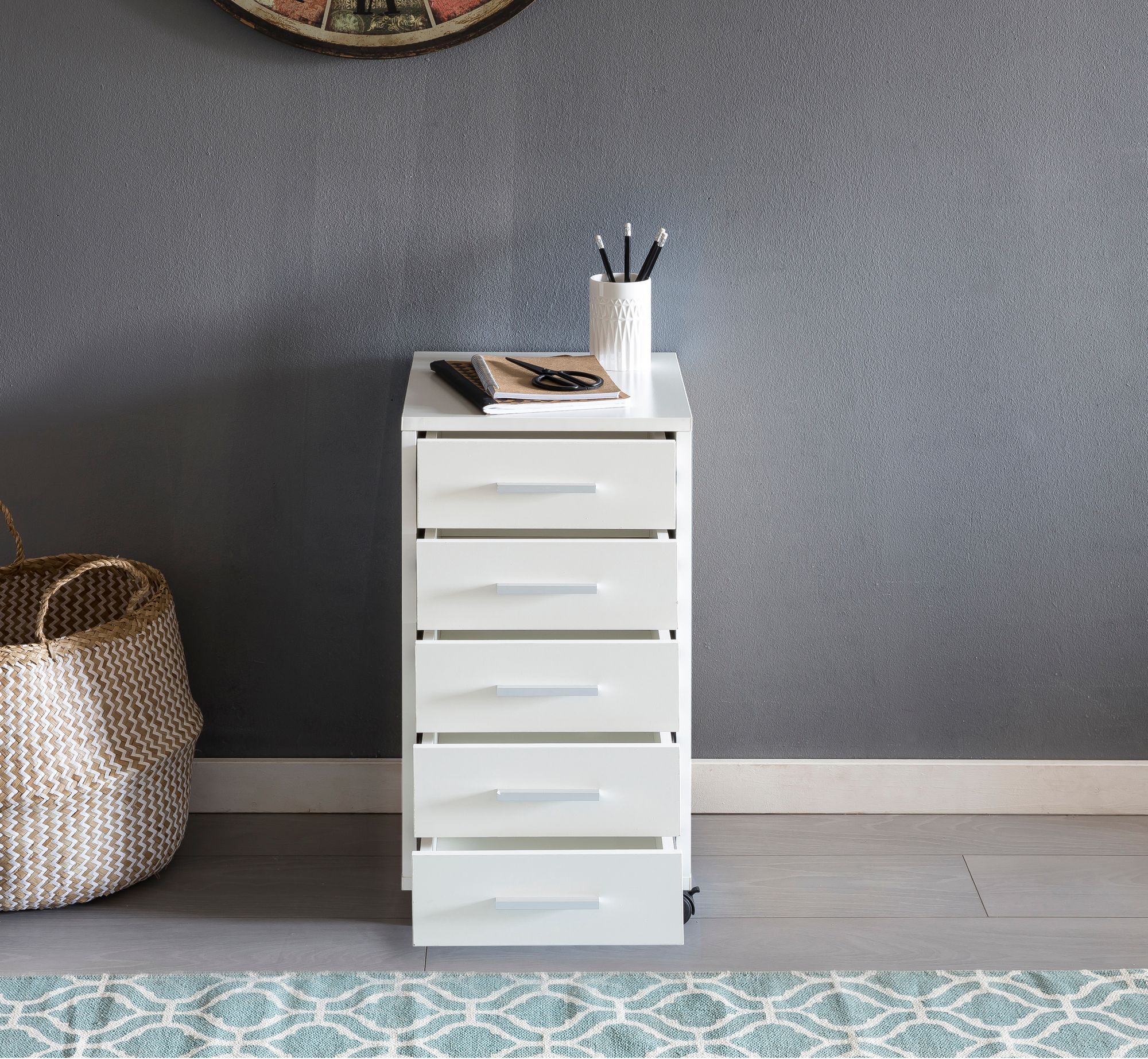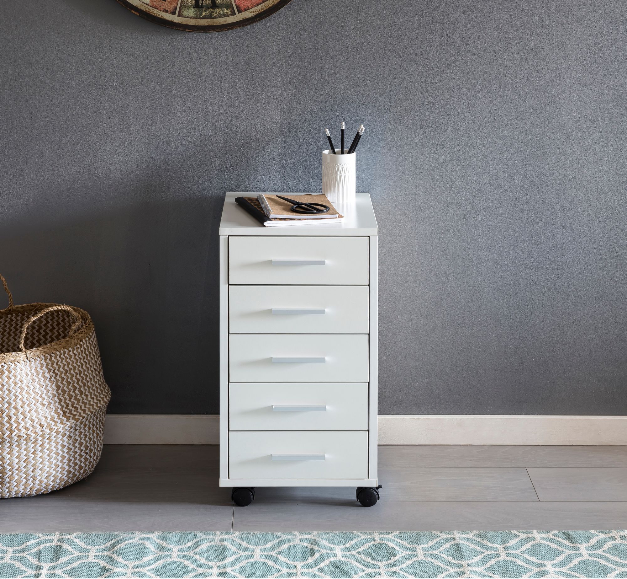 Ten biały kontener na kółkach o nowoczesnym designie to praktyczne rozwiązanie do organizacji przestrzeni pracy. Wykonany z białej melaminowanej płyty wiórowej, posiada pięć pojemnych szuflad z srebrnymi uchwytami. Solidne kółka zapewniają łatwą mobilność, z czego dwa wyposażone są w hamulce dla stabilizacji.