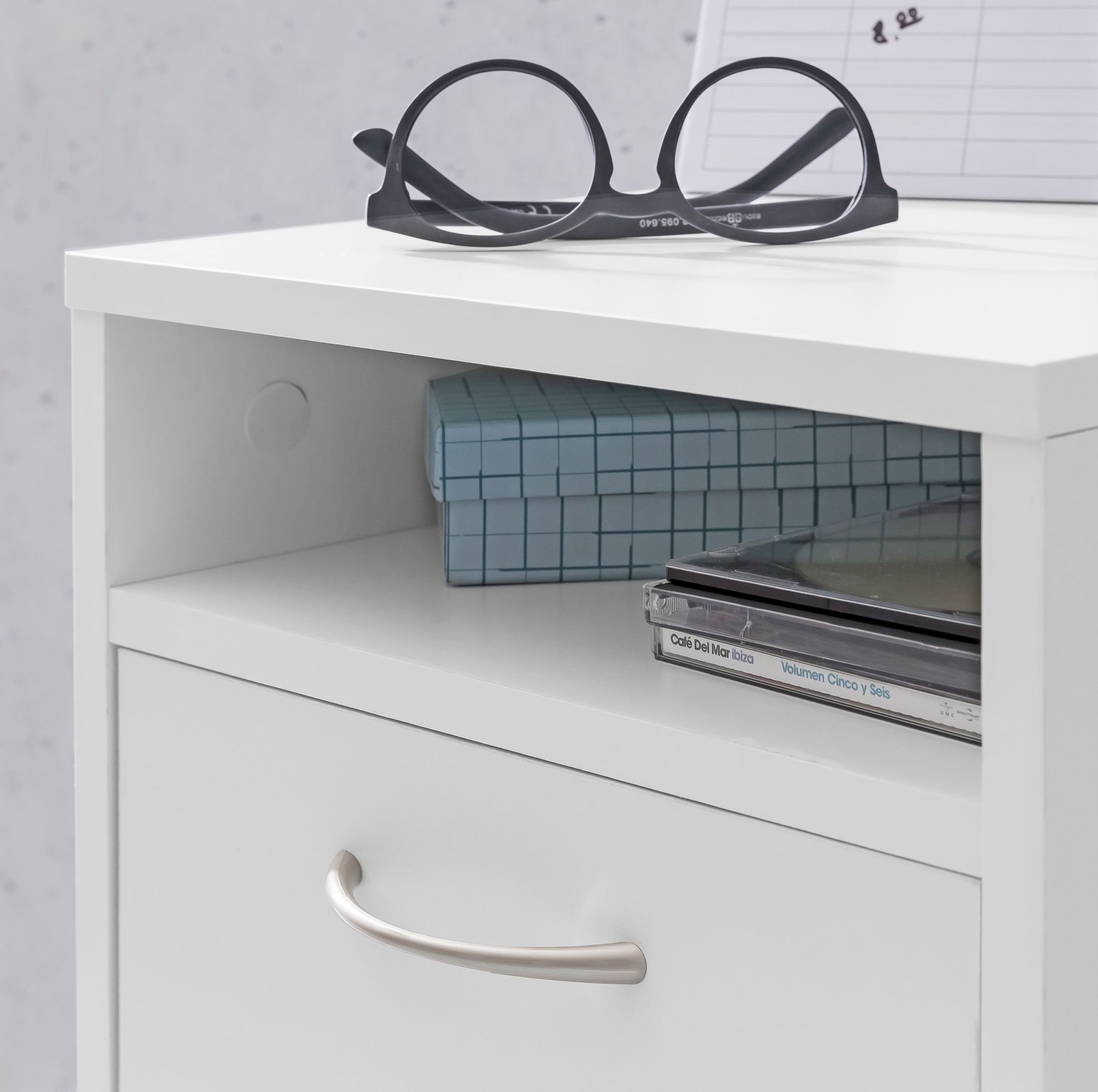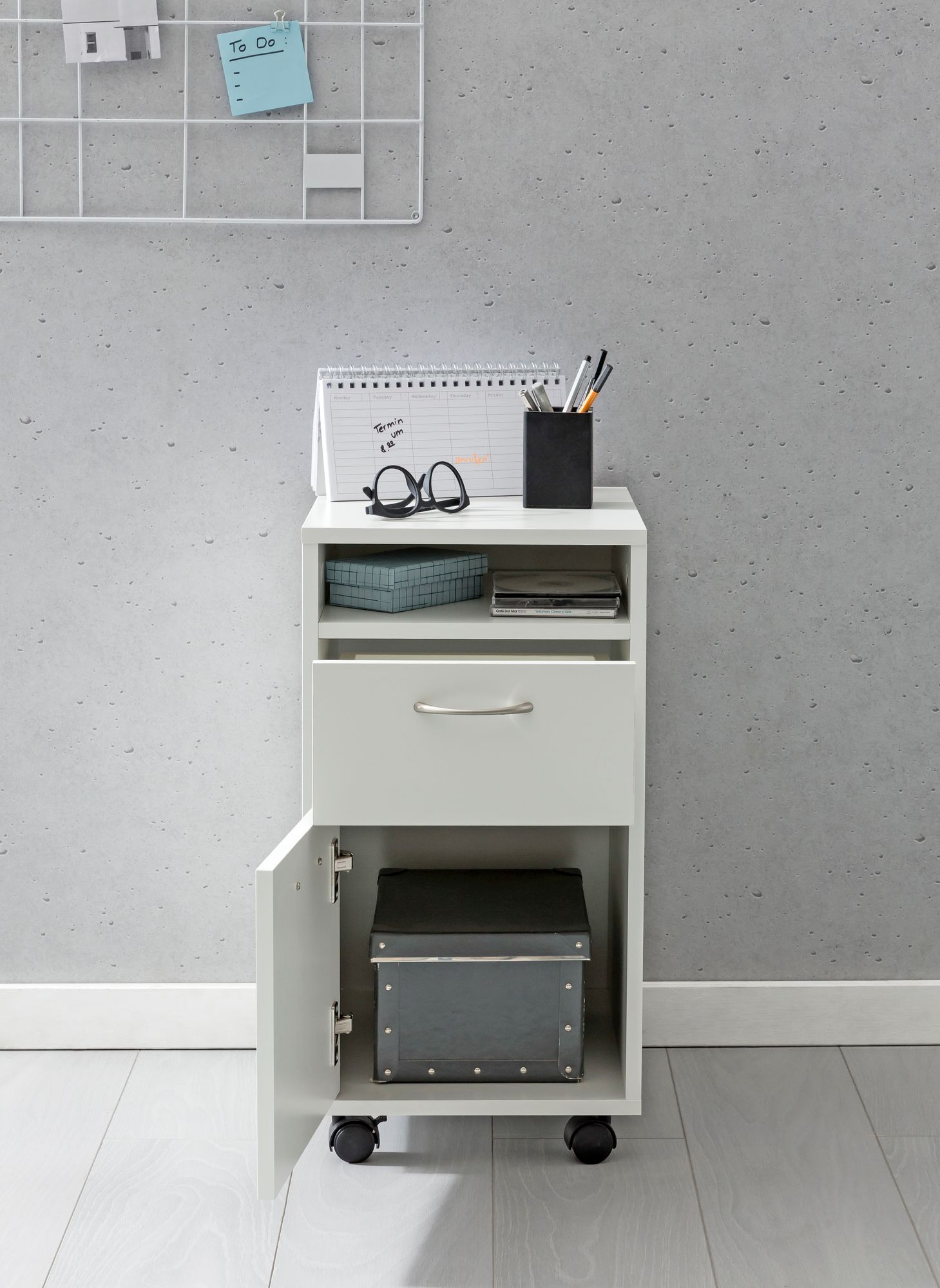 Z dwoma przegródkami, drzwiami i szufladami oferuje optymalną przestrzeń do przechowywania. Kółka z hamulcami zapewniają stabilność podczas postoju. Melaminowa powierzchnia jest odporna na zarysowania i wodę.