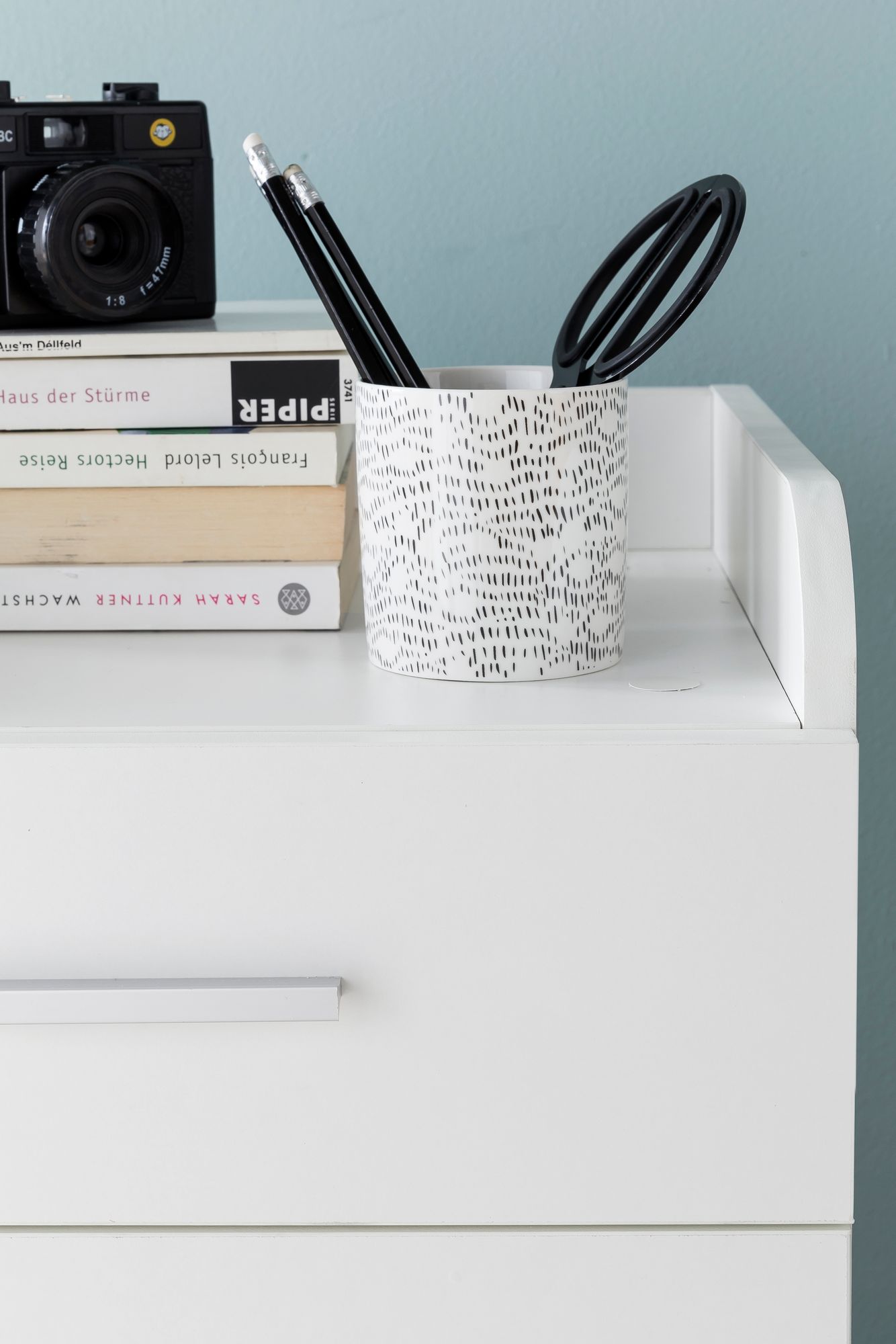 Mobilny kontener biały w nowoczesnym, ponadczasowym designie, z 4 szufladami wyposażonymi w uchwyty oraz praktyczną półką. Czarne kółka ułatwiają przemieszczanie.