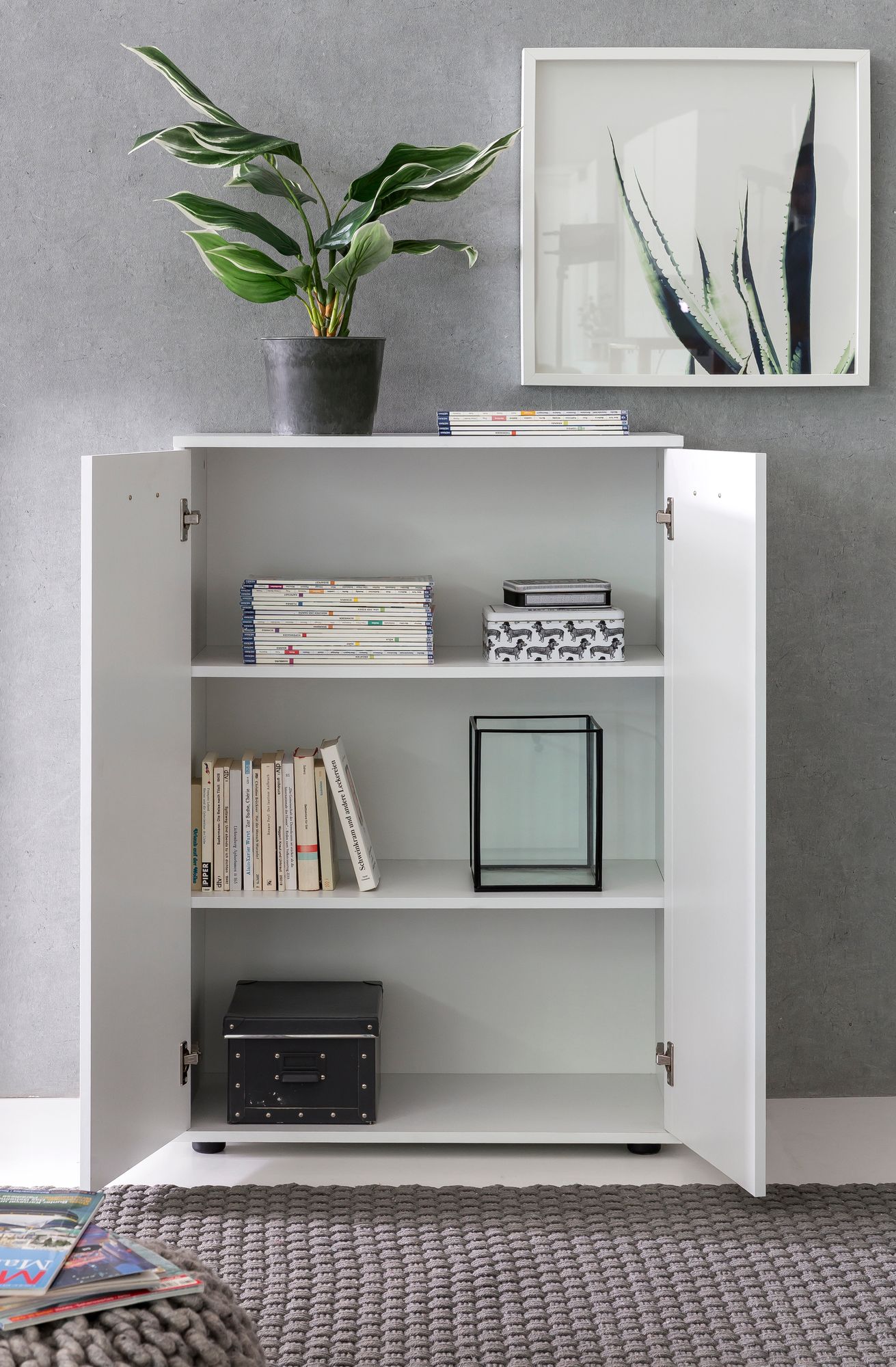 Ta matowa biała komoda z drewna łączy nowoczesny design i funkcjonalność, optymalizując miejsce do przechowywania. Wyposażona w dwie eleganckie drzwi i trzy pojemne półki, idealna do małych pomieszczeń.