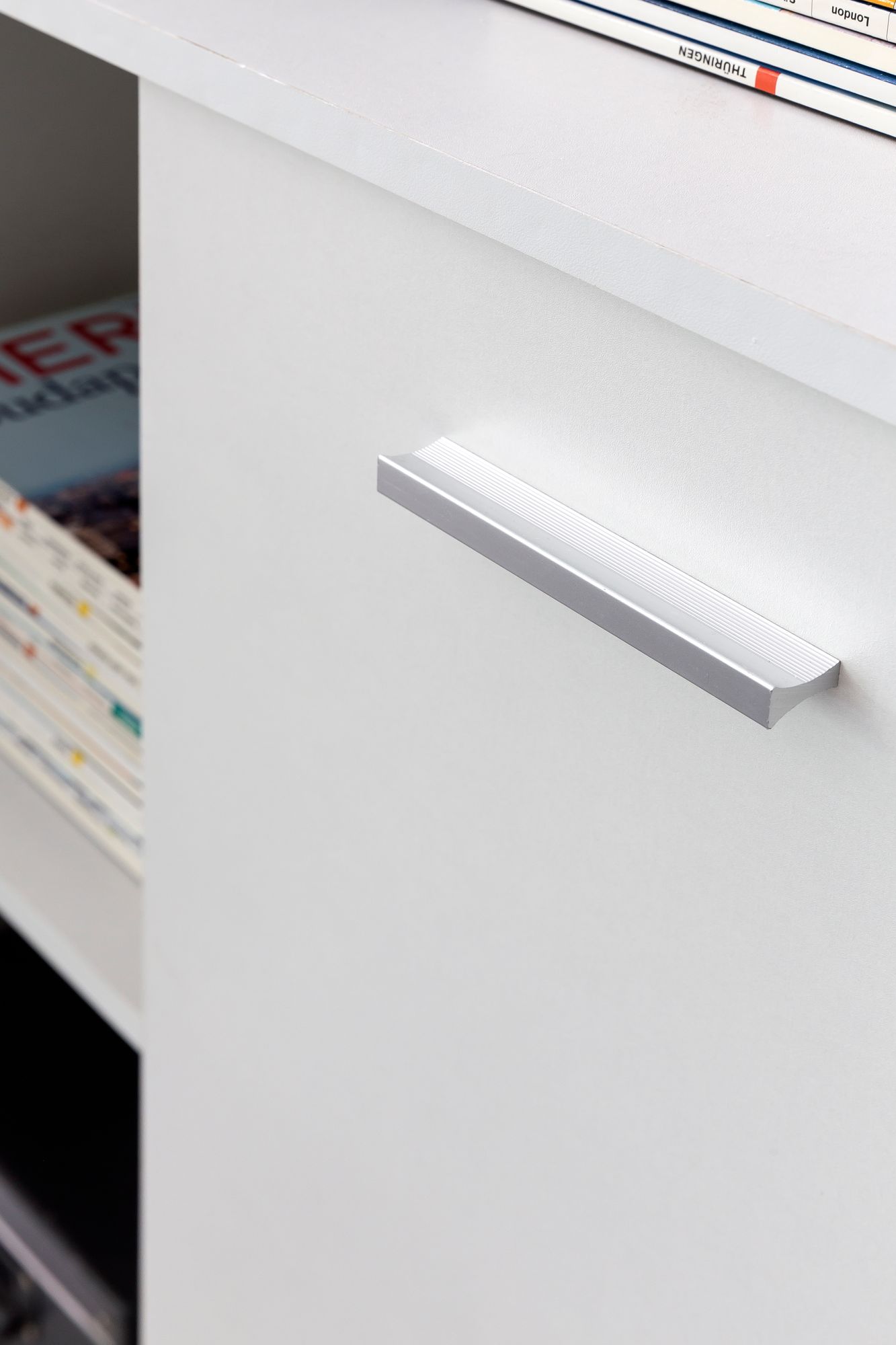 - Materiały: melaminowana płyta wiórowa, metal (uchwyty i zawiasy), tworzywo sztuczne (nogi)