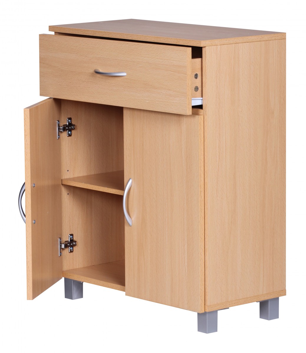 - Materiały: płyta wiórowa foliowana (korpus i szuflada), tworzywo sztuczne (uchwyty i nóżki)