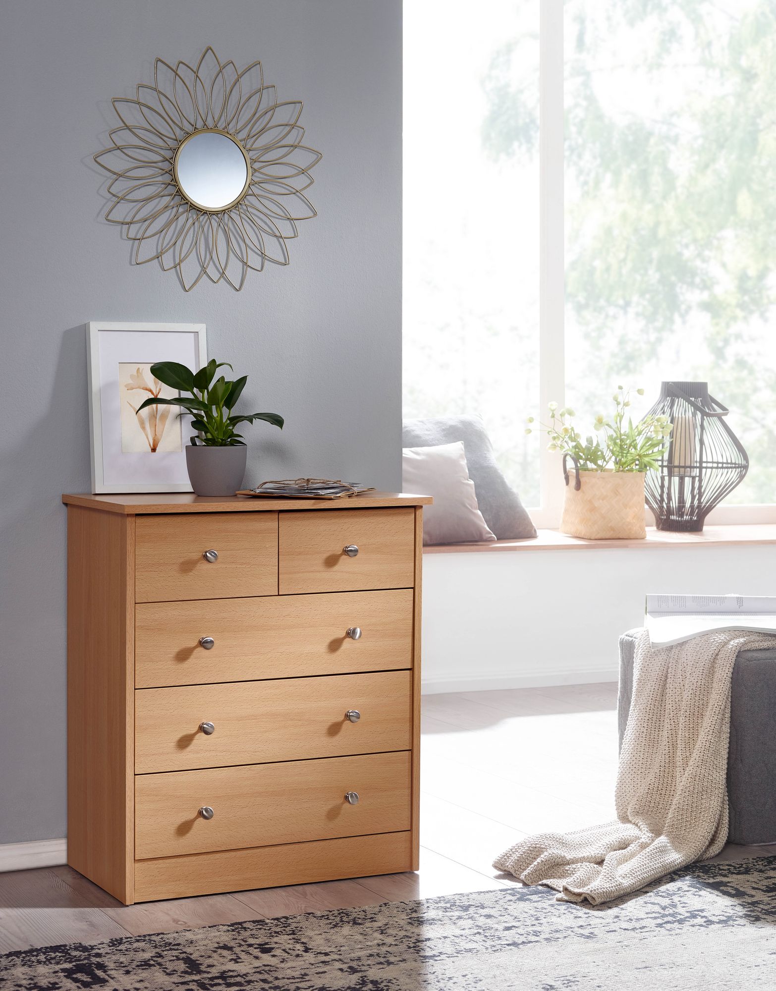 Ta jasna komoda z buku cechuje się nowoczesnym designem i pięcioma szufladami w dwóch rozmiarach, każda z uchwytami w kolorze srebra imitującymi aluminium.