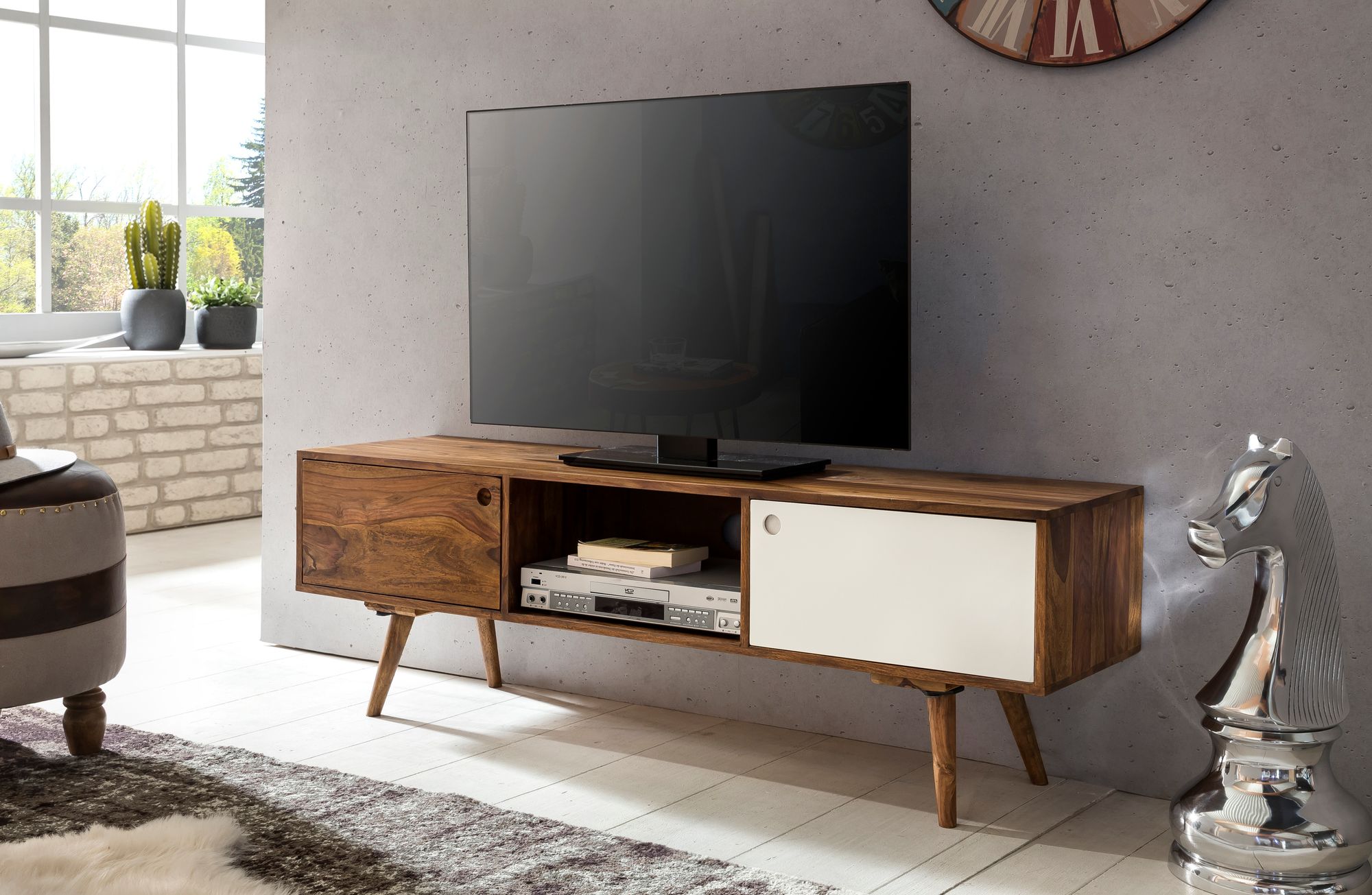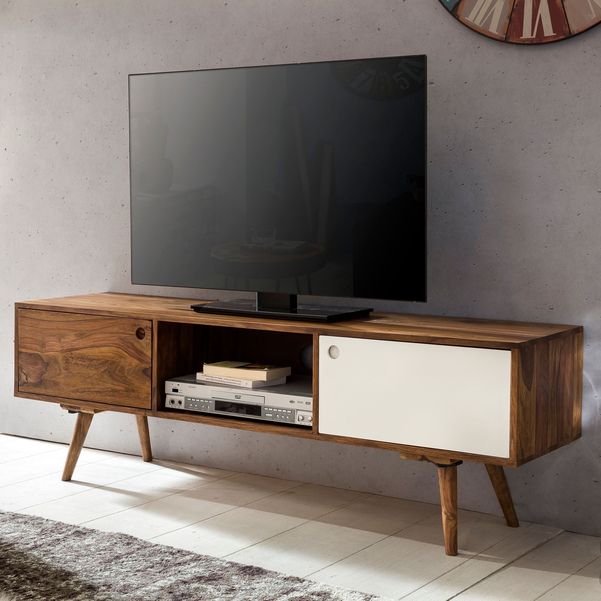 Szafka RTV REPA 140 cm | Lite drewno Sheesham | Kolor naturalny drewna & biały | Wymiary 140x45x35 cm
