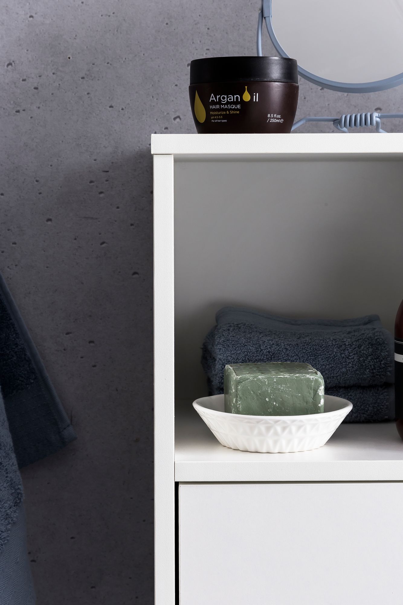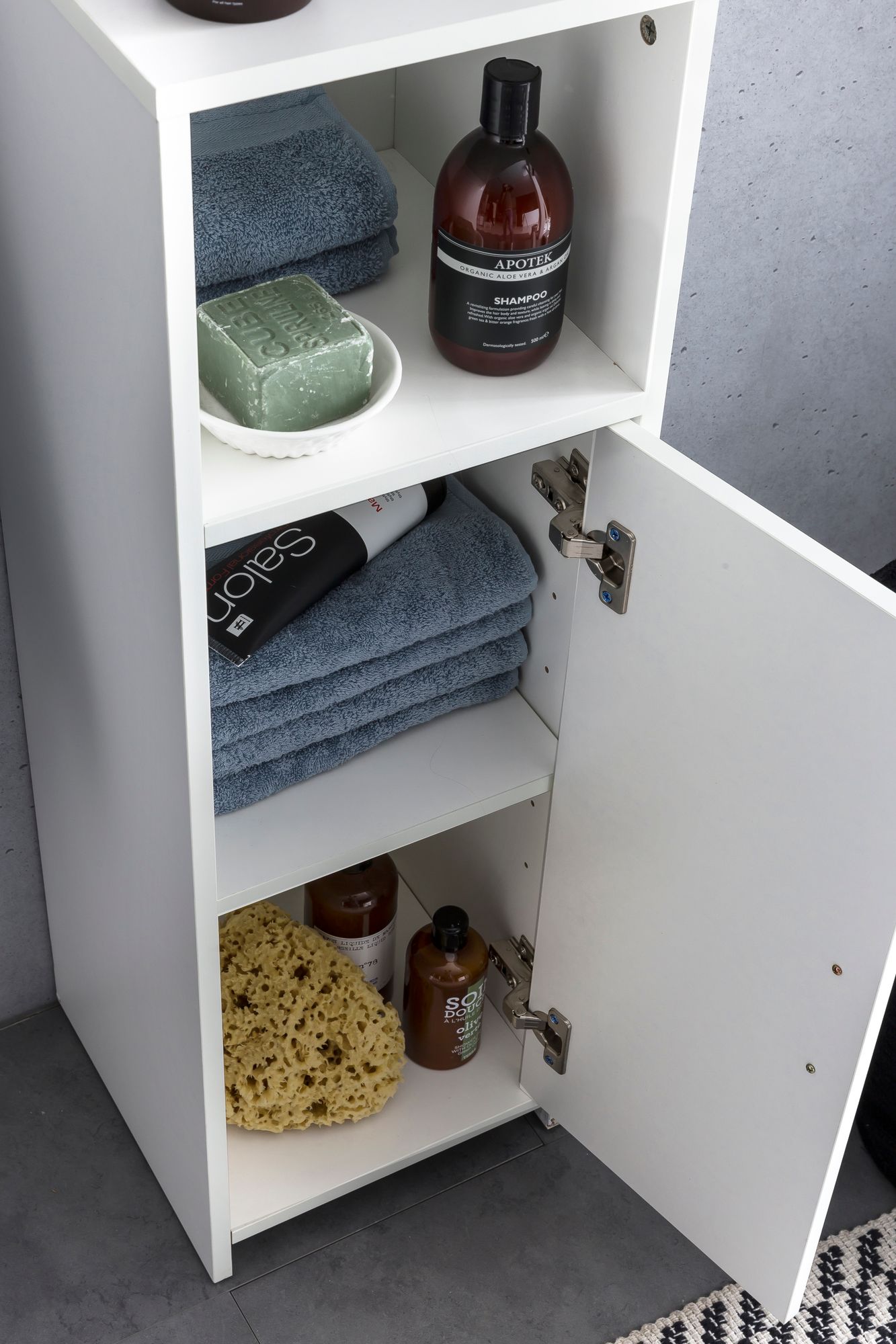 Ta biała drewniana szafka łazienkowa ma nowoczesny i ponadczasowy design, idealny do małych pomieszczeń. Posiada jedne drzwi oraz jedną półkę dla uniwersalnego przechowywania.