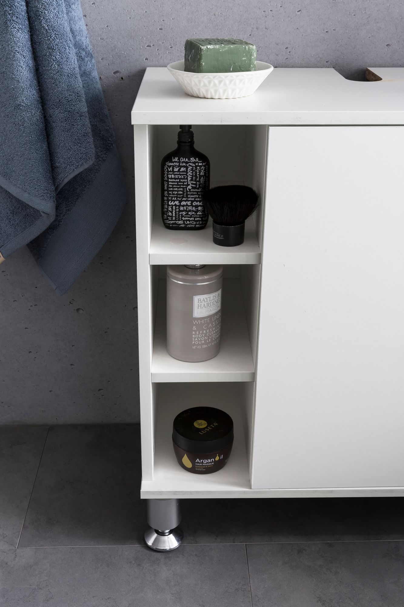 Eleganckie, regulowane nóżki w aluminiowym wykończeniu zapewniają stabilność. Wycinek na syfon pasuje do standardowych umywalek.