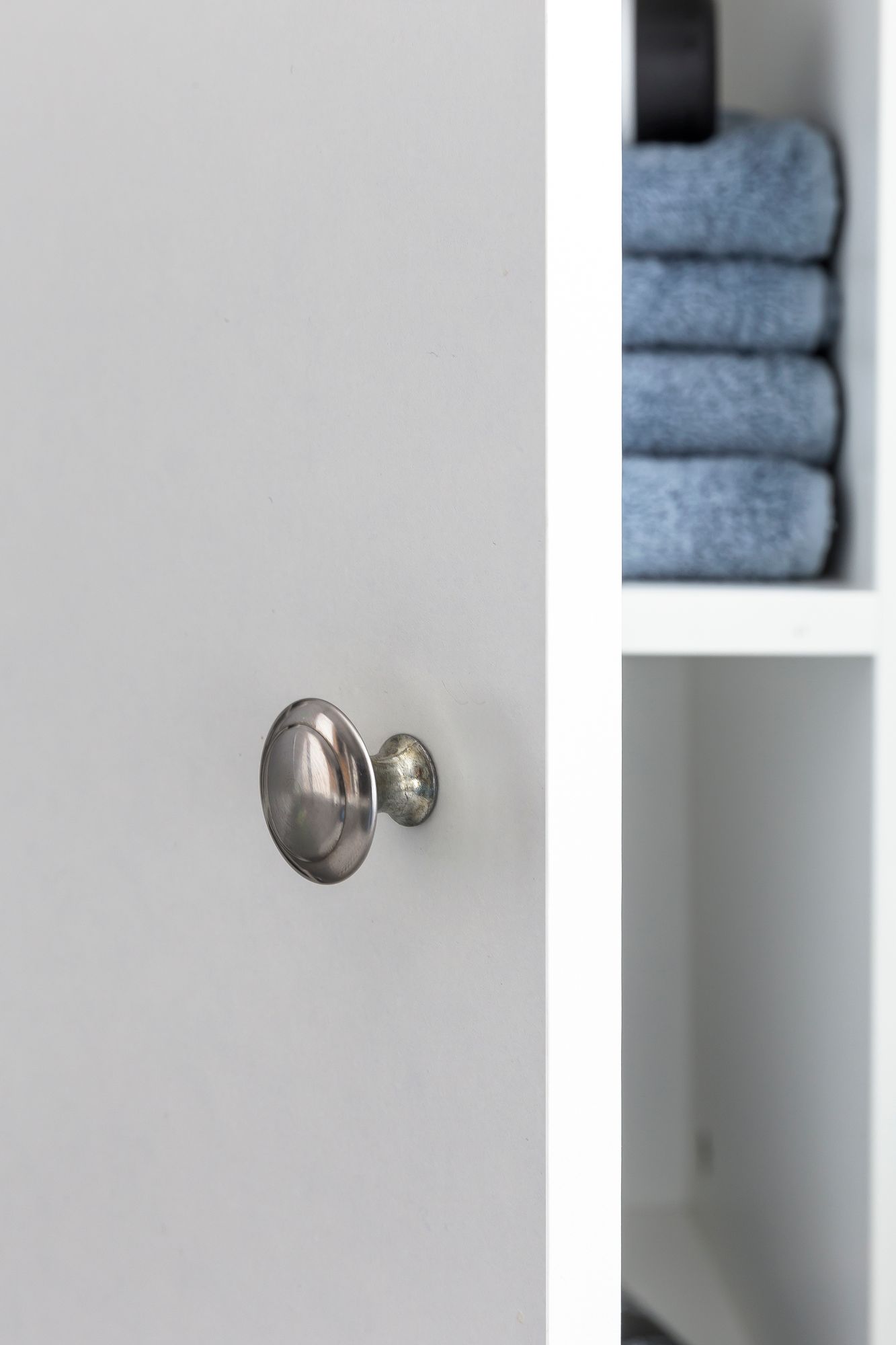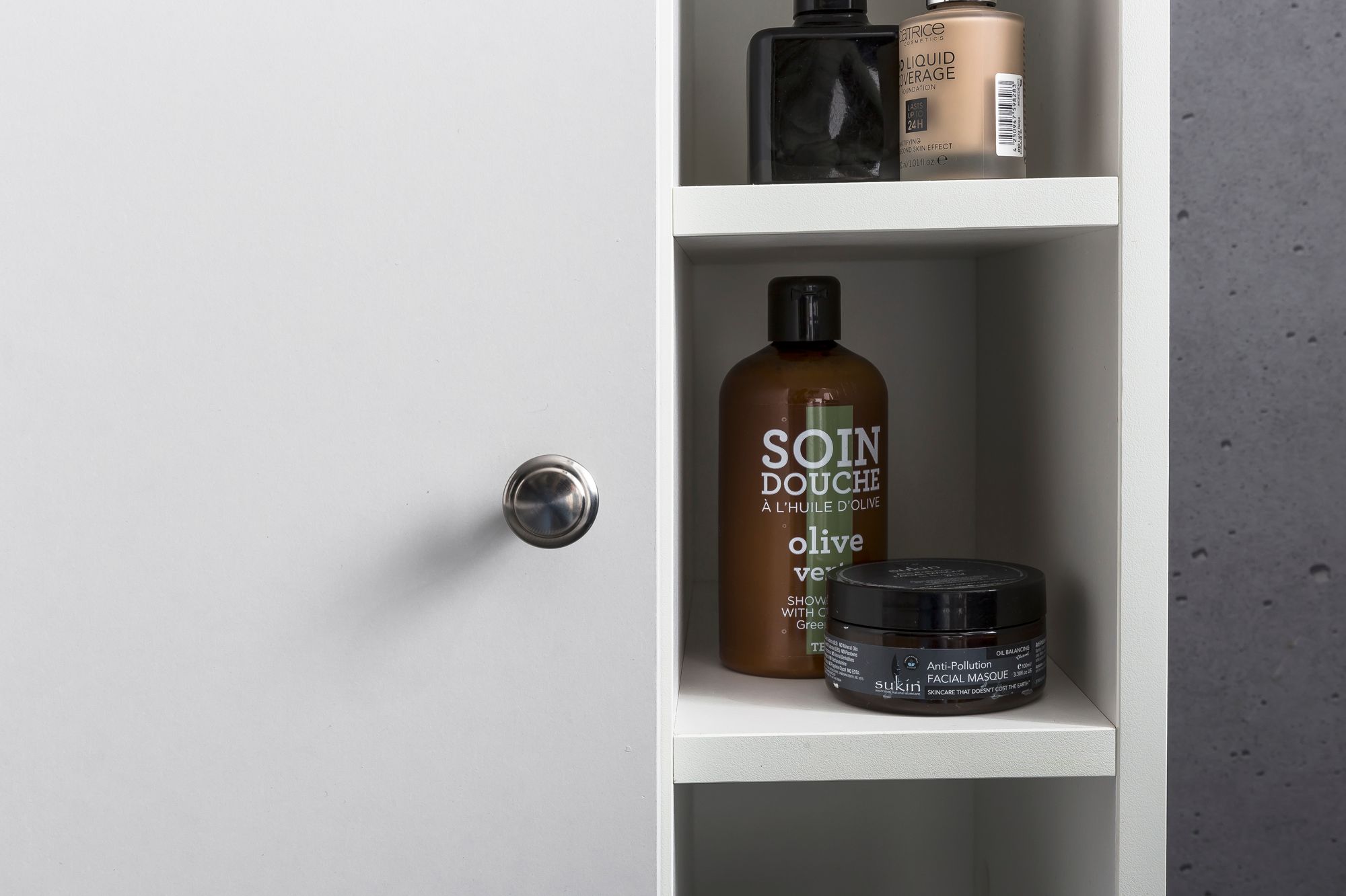 Ten biały drewniany szafka pod umywalkę łączy nowoczesny design z funkcjonalnością. Posiada jedne drzwi i 6 półek, oferując dużo miejsca do przechowywania akcesoriów łazienkowych.