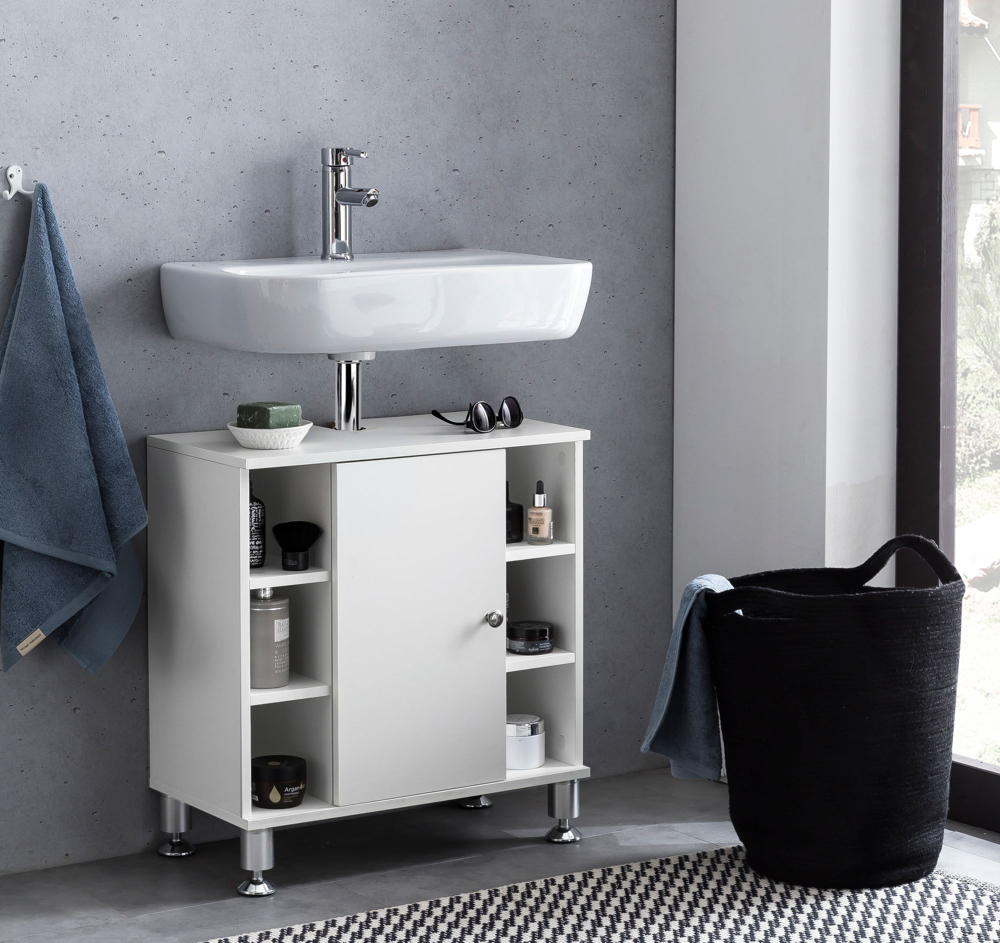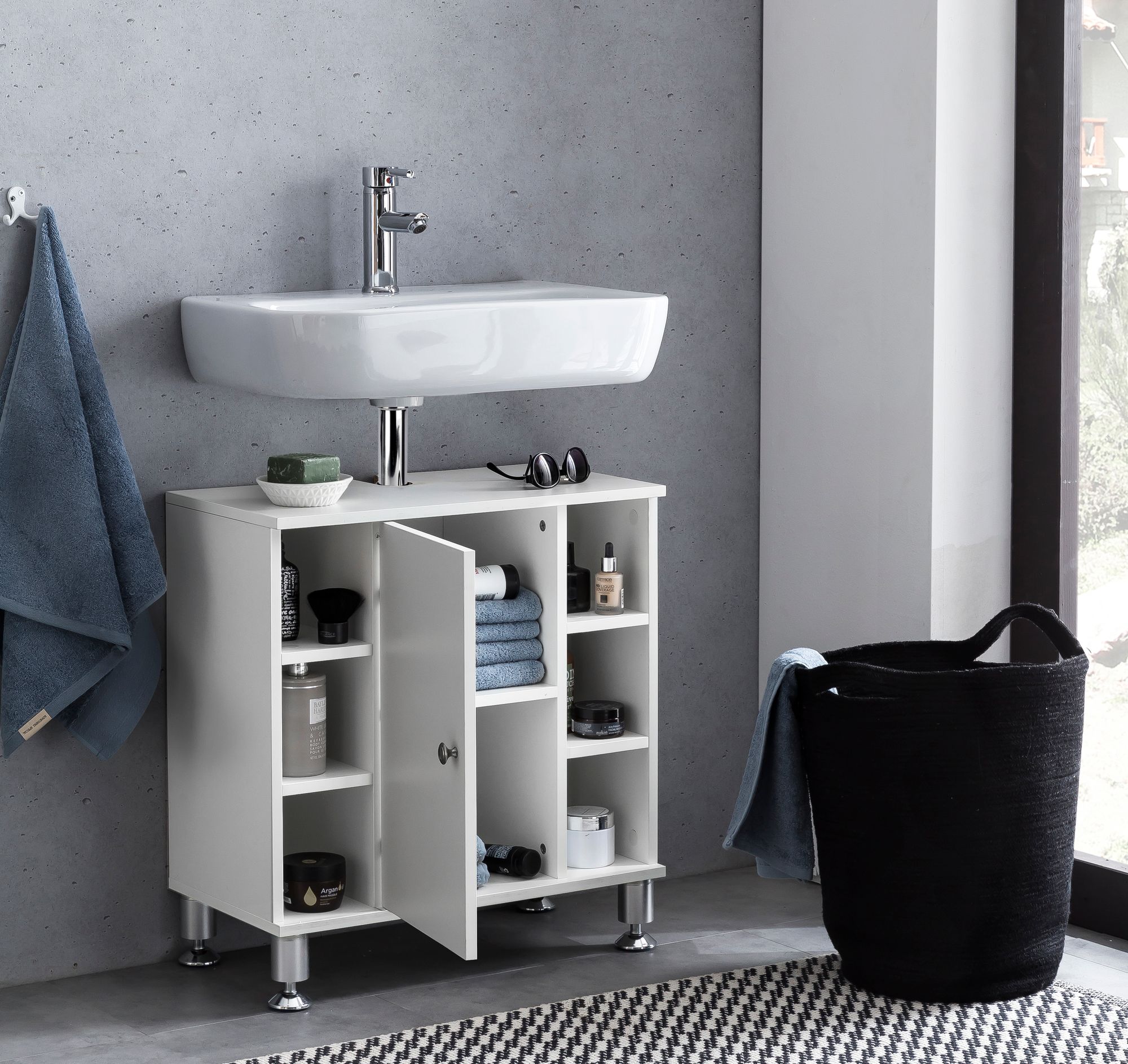 Biały drewniany szafka pod umywalkę 60x64x32 cm | Aluminiowy uchwyt | Szafka łazienkowa z półkami