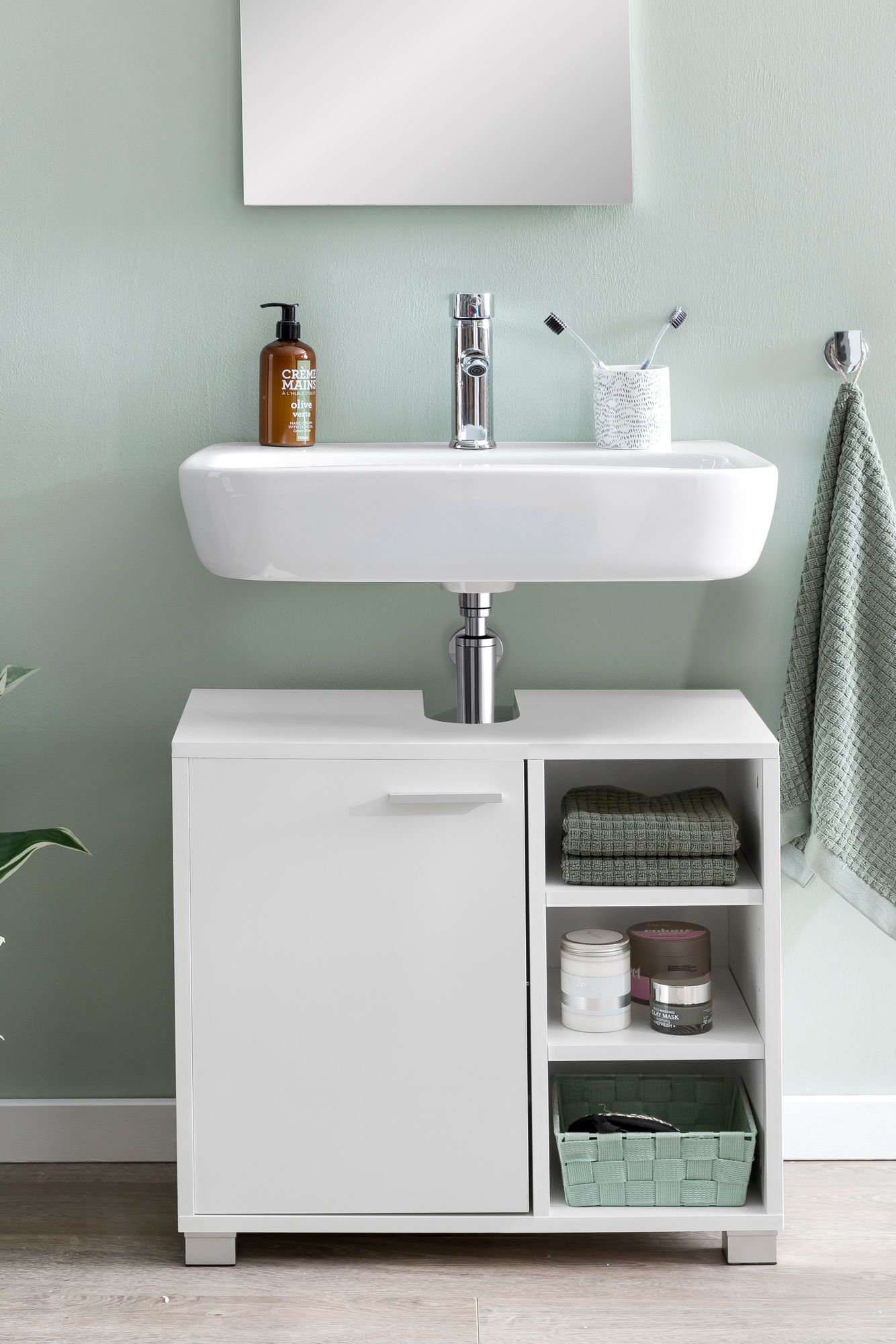 Biały mebel pod umywalkę łączący nowoczesny design z funkcjonalnością. Wykonany z płyty wiórowej pokrytej melaminą, odpornej na wodę i zarysowania. Posiada jedne drzwi i trzy półki zapewniające dużą pojemność. Uchwyt oraz nóżki wykonane z aluminium, gwarantujące stabilność i elegancję.