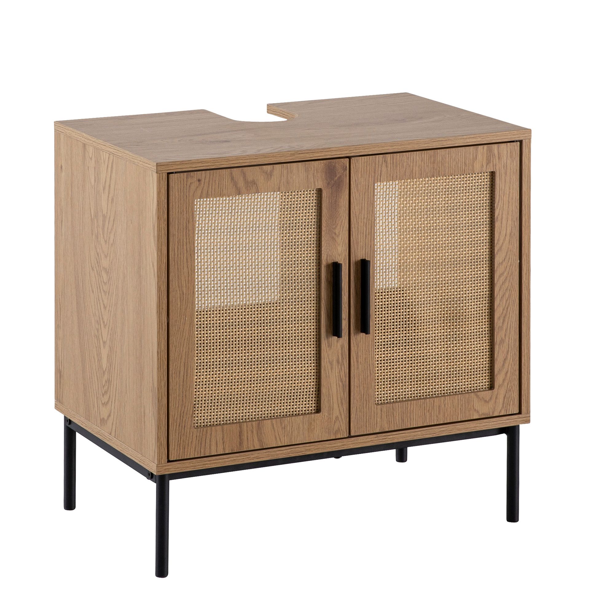 Fronty drzwi posiadają wyraźne plecionki polirattanowe, które dodają naturalnego uroku. Kompaktowe wymiary 60x60x40 cm pozwalają na łatwe dopasowanie do małych łazienek. Wewnątrz dwa schowki z wycięciem na syfon.