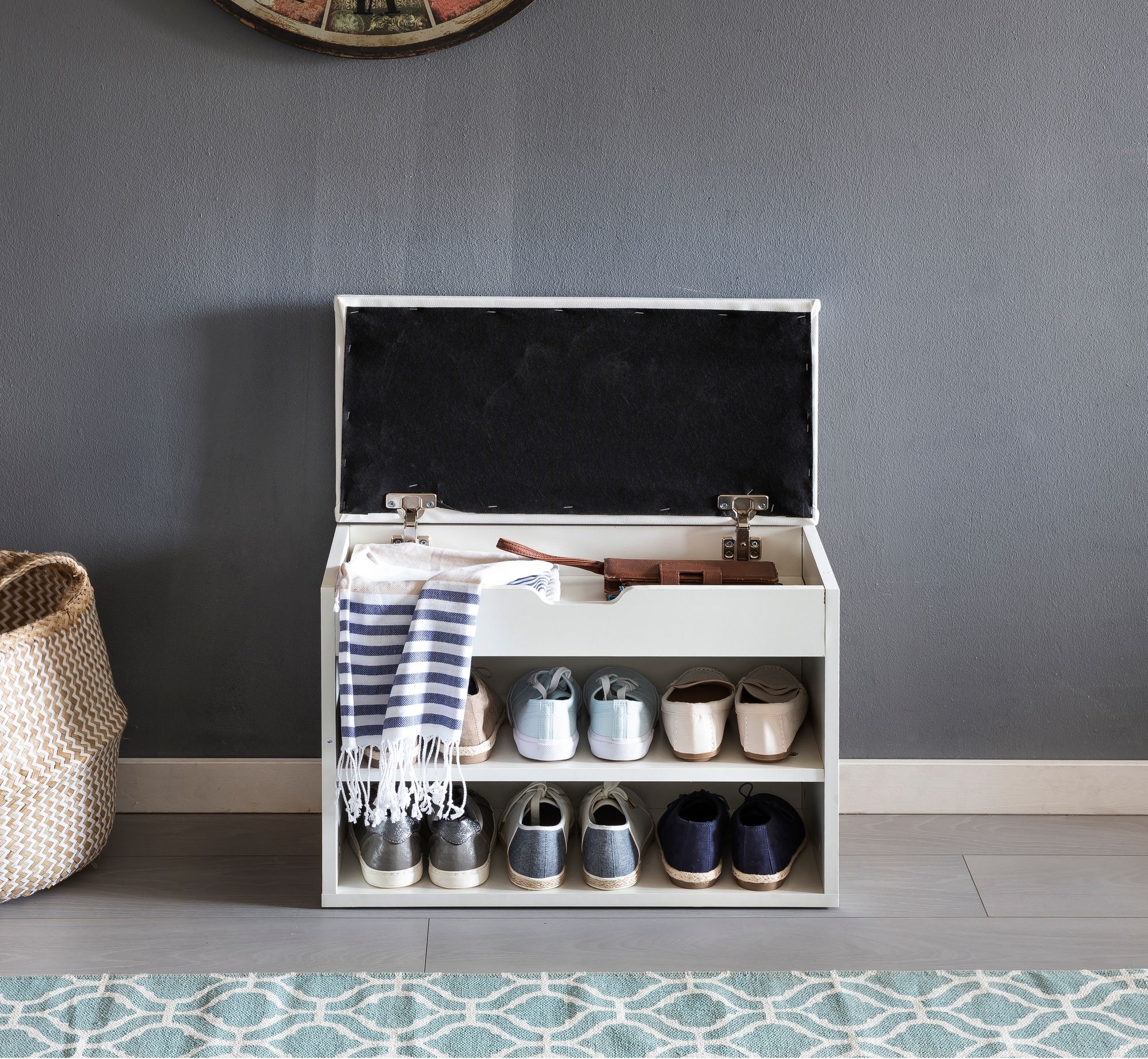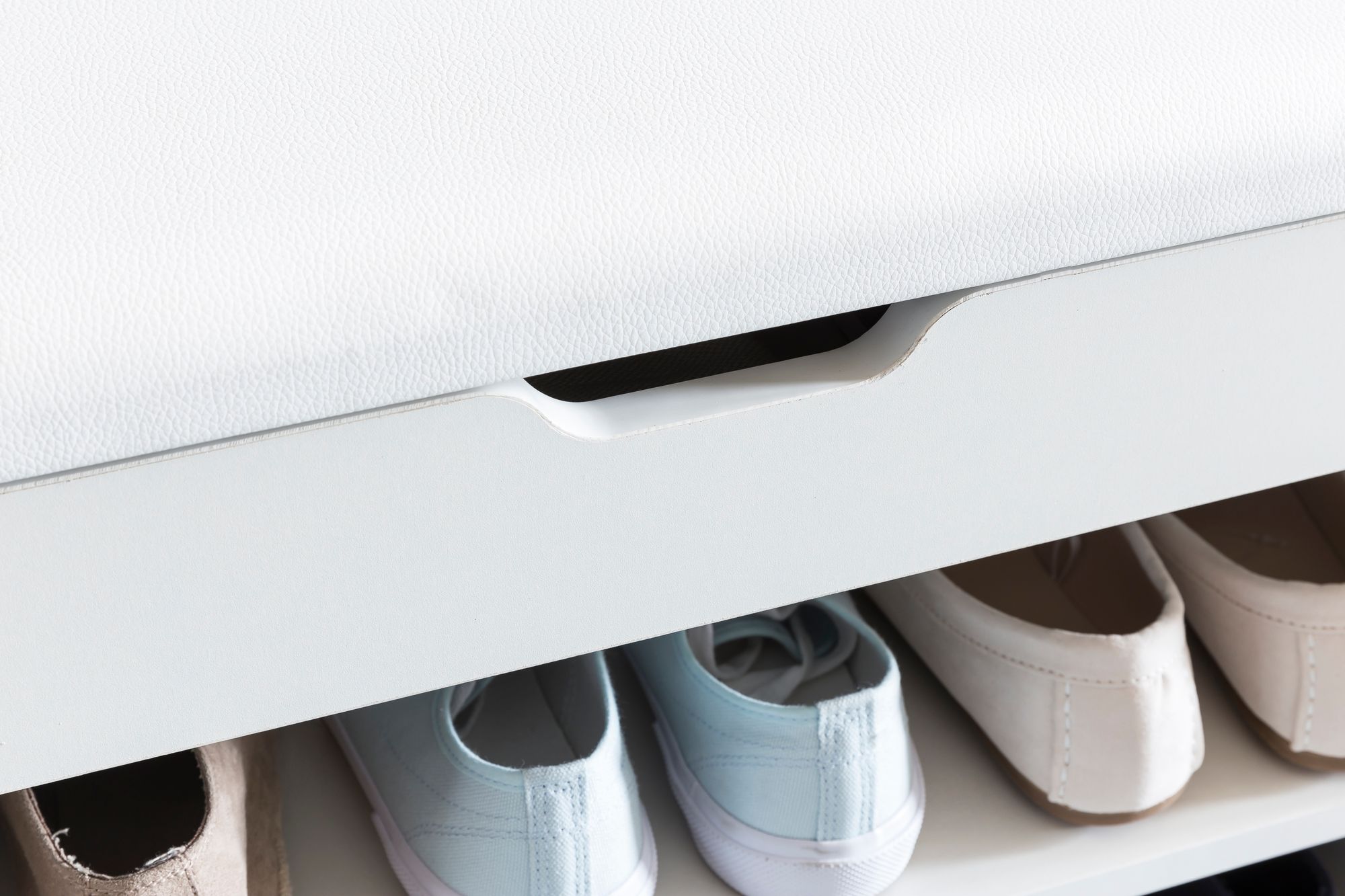 Informacje dot. produktu "Biała ławka na buty z białym siedziskiem z ekoskóry | Drewno 60x40x30 cm"