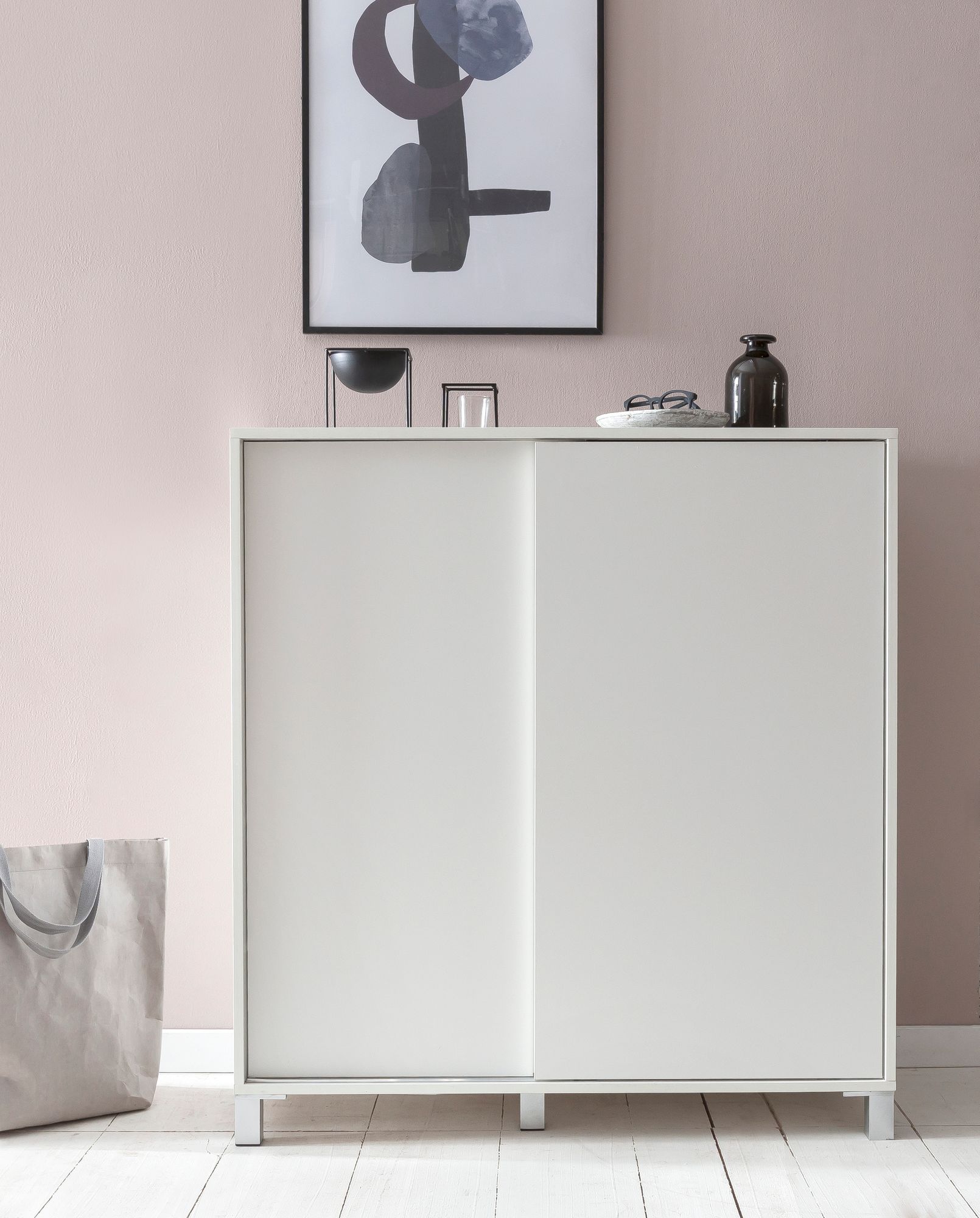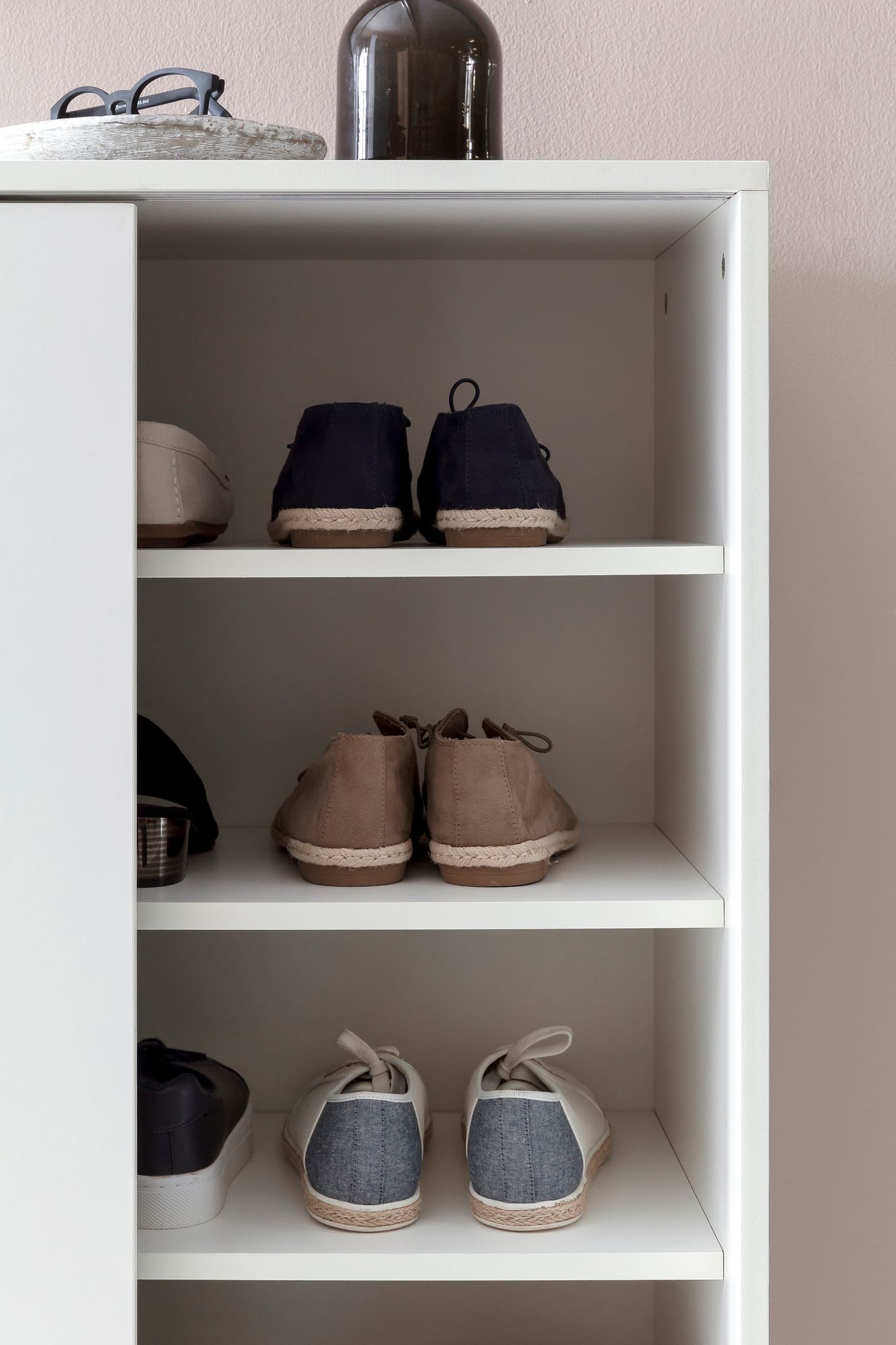 Ta nowoczesna biała szafka na buty posiada pięć wysuwanych półek, oferujących miejsce na około 20 par butów, bazując na rozmiarze 42. Chroni ściany dzięki solidnej tylnej ściance oraz posiada antypoślizgowe nóżki zapobiegające zarysowaniom podłogi.