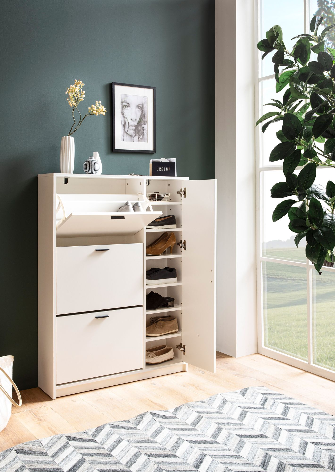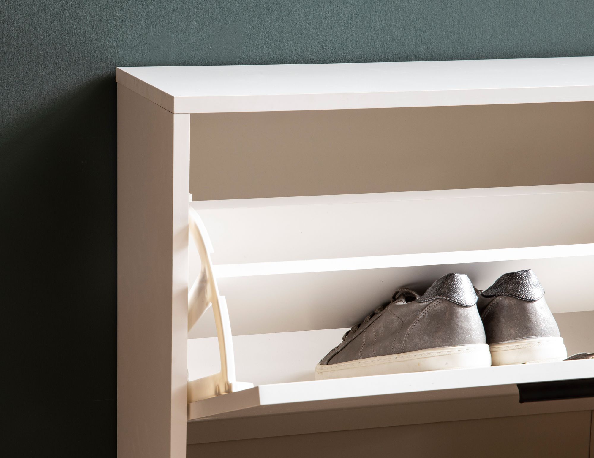 Zmaksymalizuj miejsce w przedpokoju dzięki tej białej szafce na buty wykonanej z lakierowanego MDF z eleganckimi czarnymi uchwytami. Zapewnia praktyczne i kompaktowe rozwiązanie do przechowywania obuwia.
