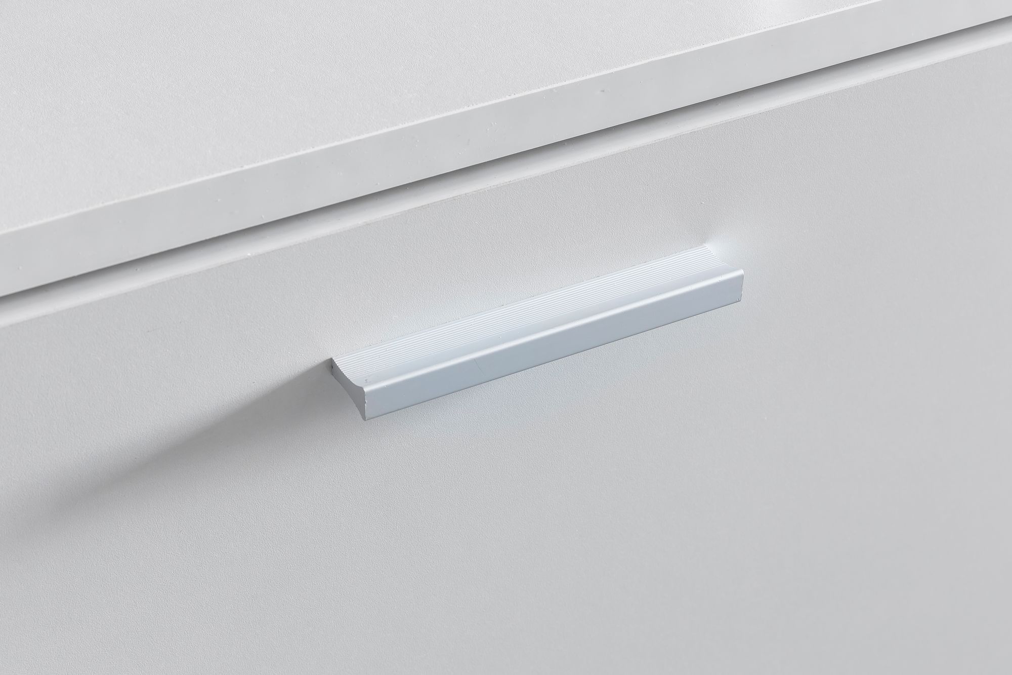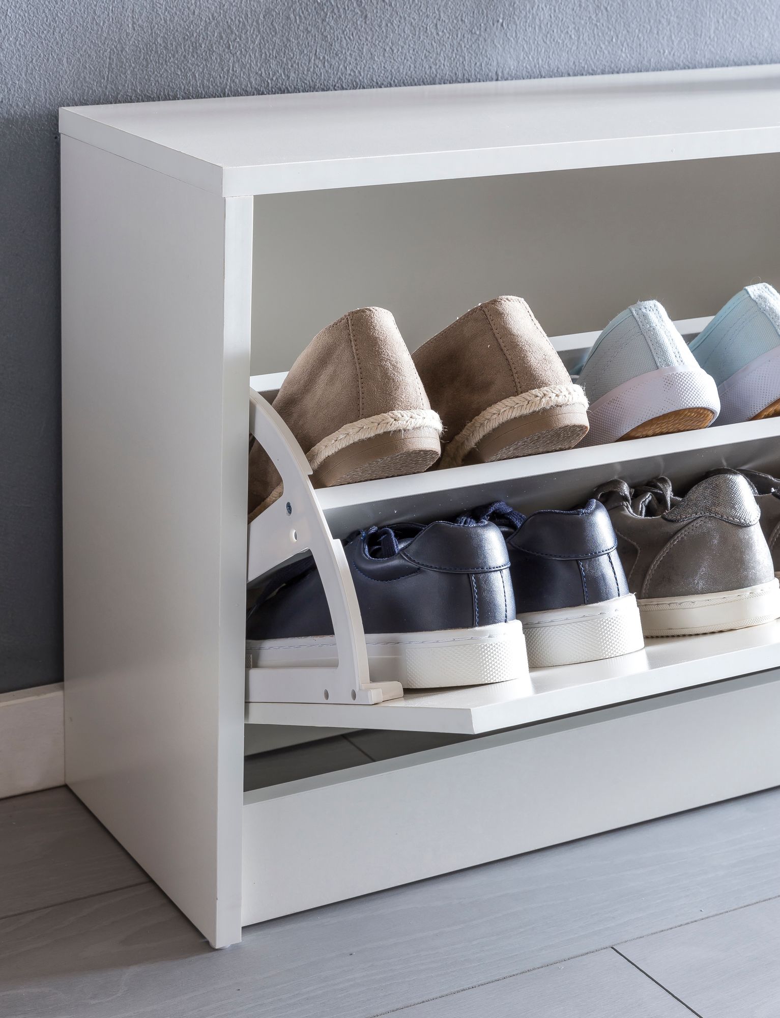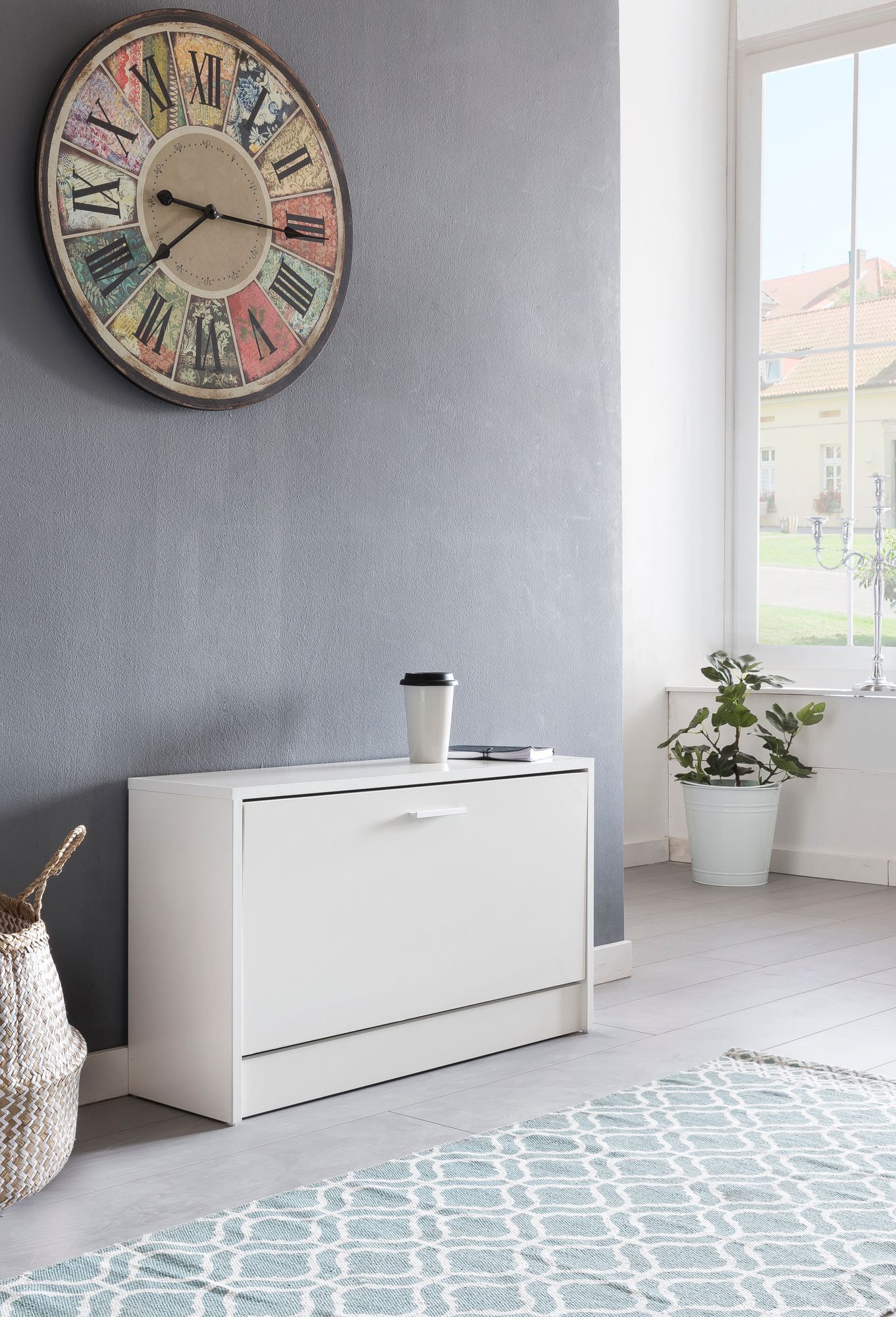 Ta biała, drewniana ławka na buty ma nowoczesny i prosty design, idealna do przedpokoju. Kippfach z dwoma półkami zapewnia maksymalną pojemność na buty, a także wygodne siedzisko i miejsce na drobne przedmioty.