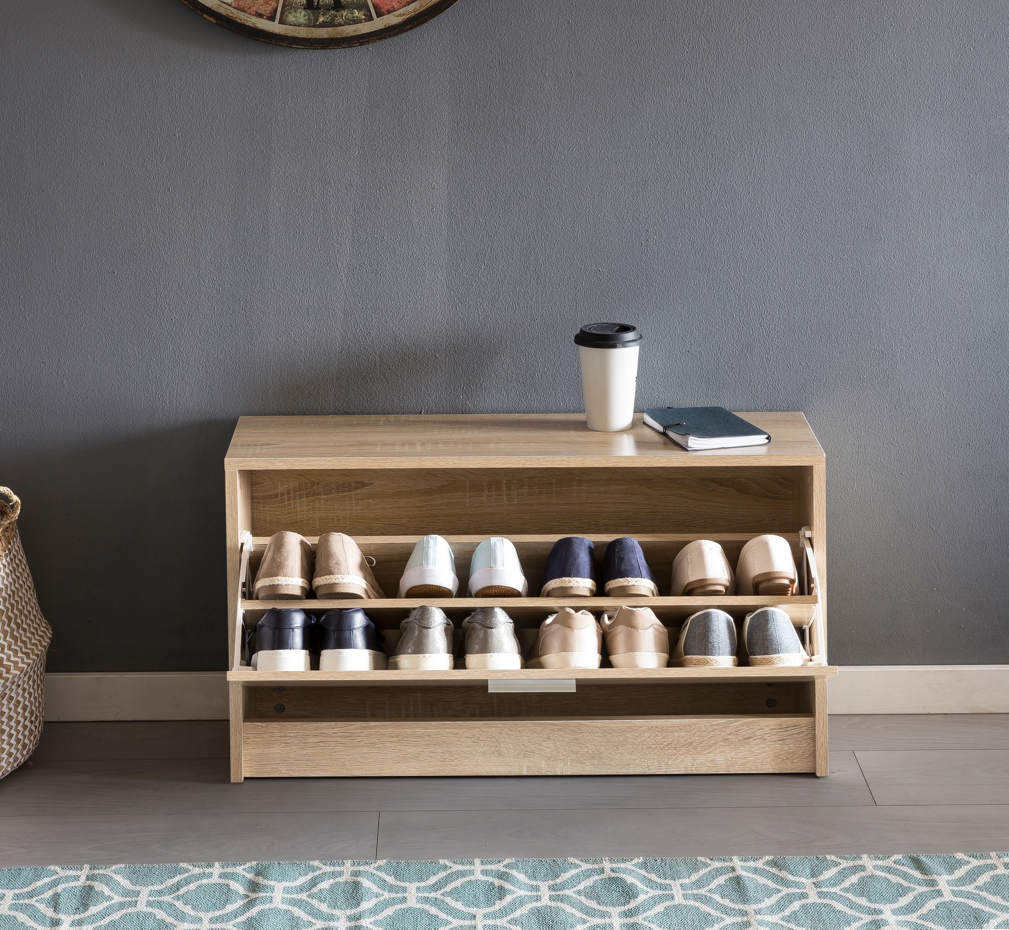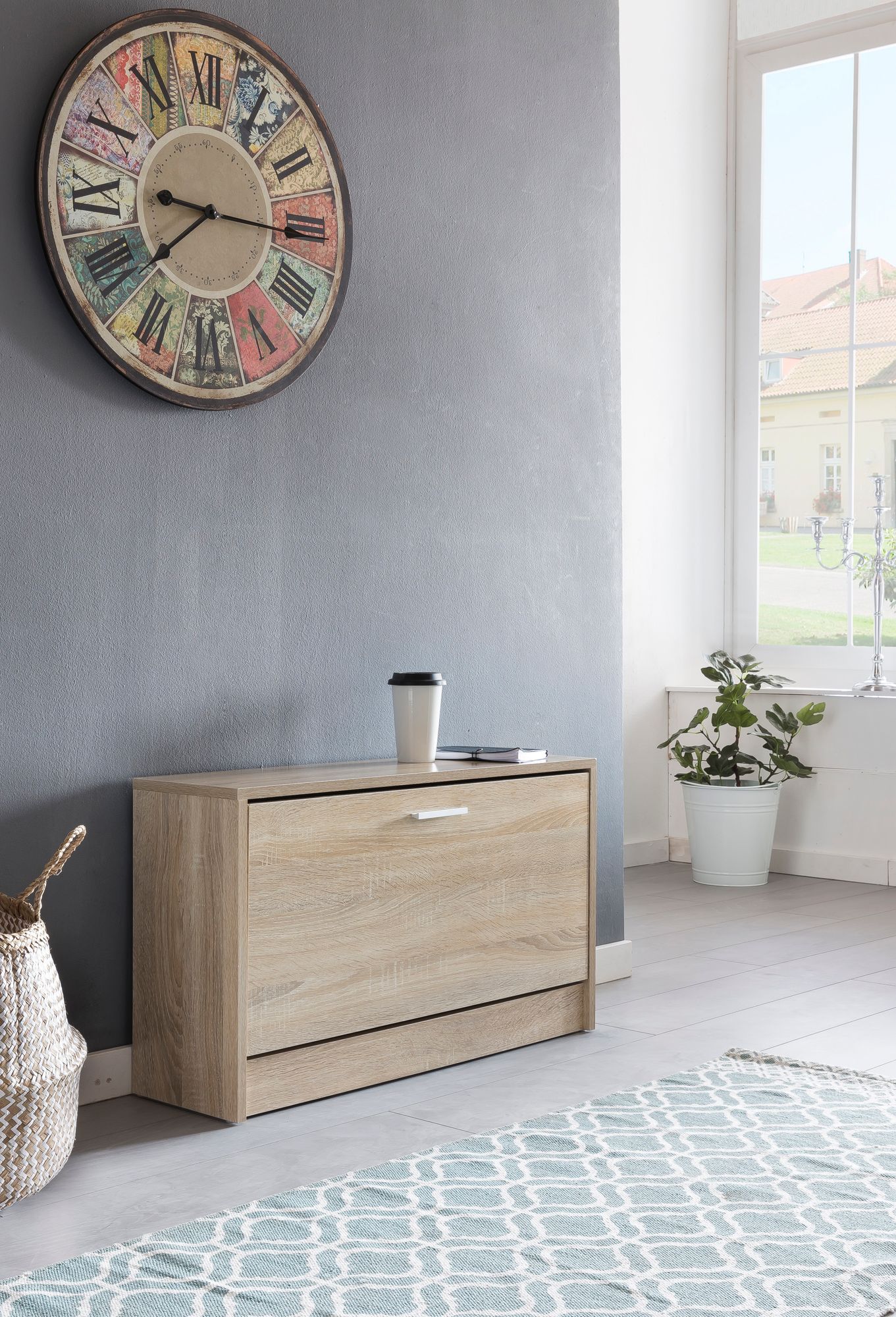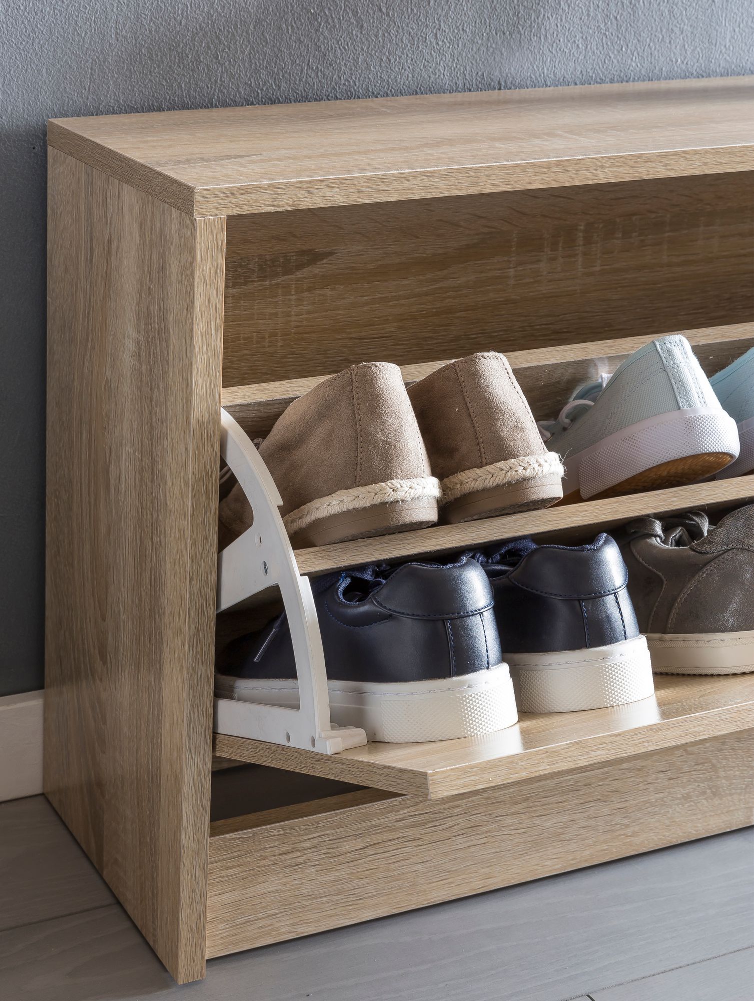 Poznaj tę ławkę na buty z drewna Sonoma o nowoczesnym, prostym designie, idealną do przedpokoju. Przesuwana przegroda z dwoma poziomami zapewnia dużo miejsca na buty oraz poręczną powierzchnię na drobne przedmioty.