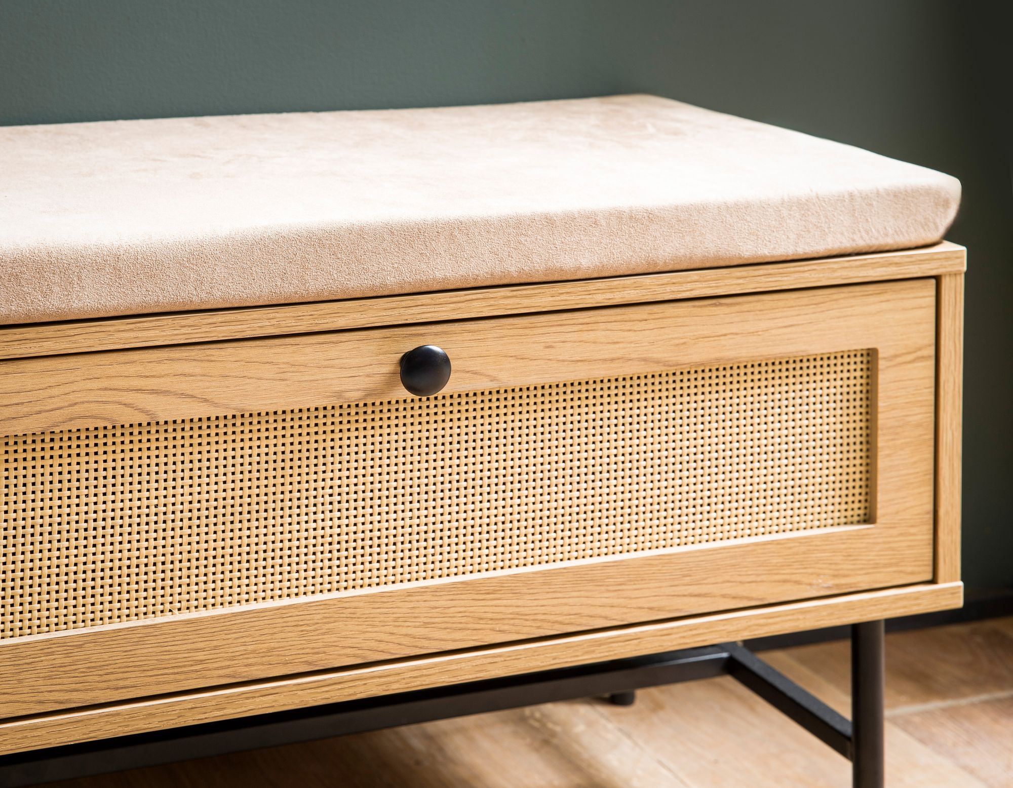 Nowoczesna ławka na buty z miękkim, beżowym materiałowym siedzeniem, szufladą i drzwiami oraz dekoracją dębową. Idealna do przedpokojów, wymagających dodatkowej organizacji przestrzeni.