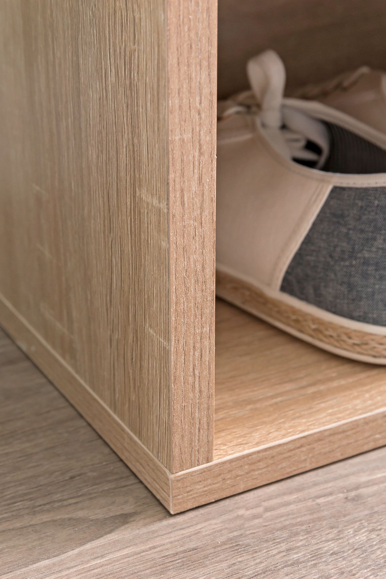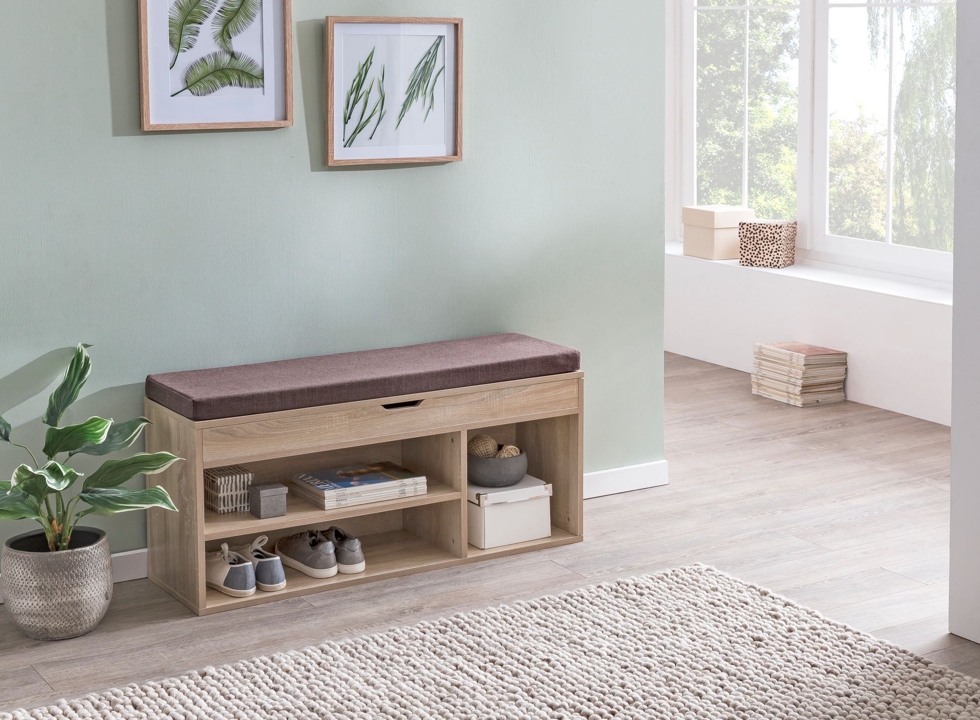 Ławka do przechowywania Sonoma łączy nowoczesny wygląd z praktycznymi funkcjami. Wykonana z trwałych paneli melaminowanych w jasnym dekorze drewna Sonoma, posiada miękko tapicerowane brązowe siedzisko o grubości 5 cm dla komfortu. Dwa poziomy przechowywania oferują dużo miejsca na buty i akcesoria w przedpokoju.