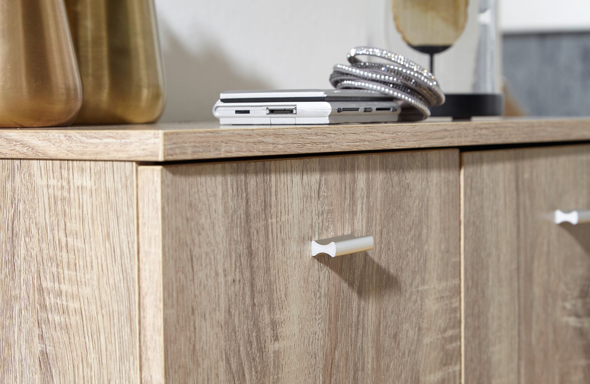 - Materiał: korpus i półki z laminowanej płyty wiórowej, uchwyty i nóżki z mocnego plastiku, okucia metalowe