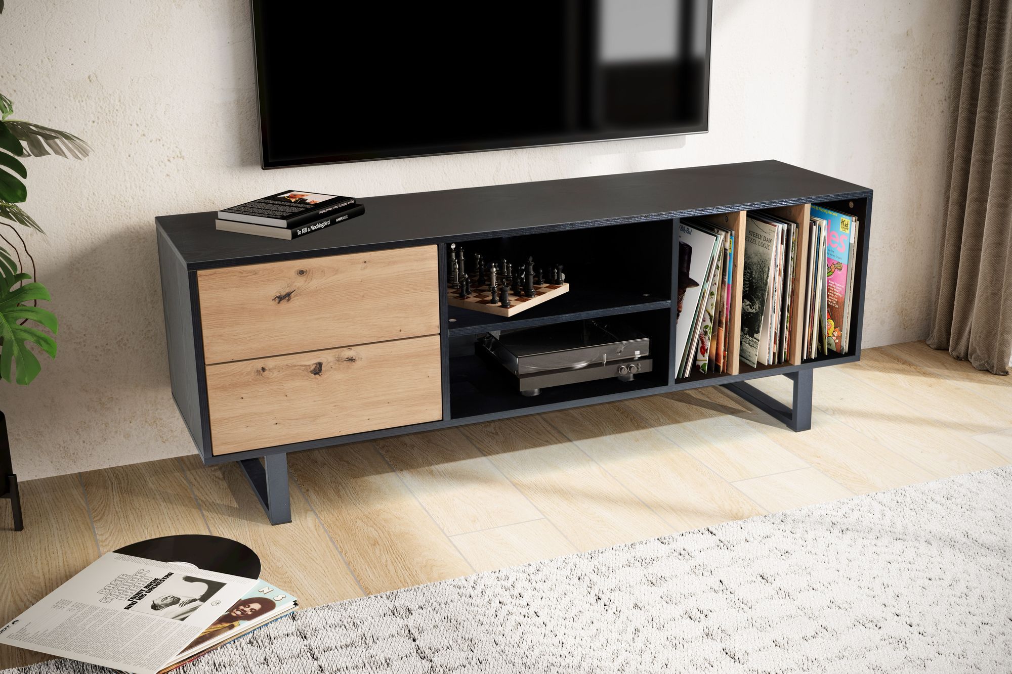 Ten lowboard łączy nowoczesny design z eleganckim czarnym wykończeniem oraz frontami w dekorze dębowym, idealny do współczesnych wnętrz. Duża powierzchnia (150x55x40 cm) pomieści telewizory do 70 cali.