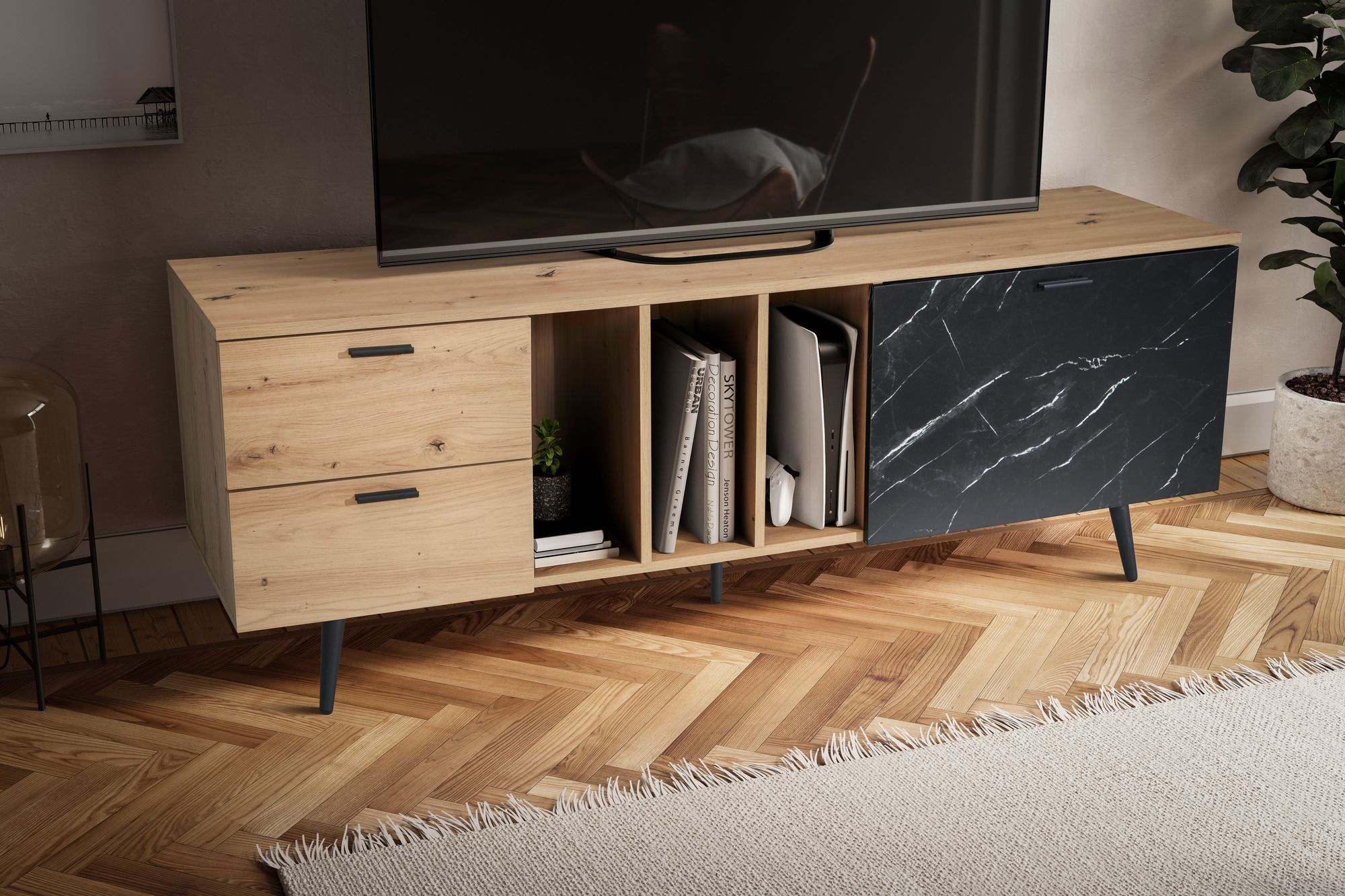 Nowoczesny lowboard z dekoracją dębową i drzwiami w czarnym marmurze, nadający wnętrzu luksusowy, współczesny charakter. Przeznaczony dla telewizorów do 70 cali, oferuje praktyczne miejsce do przechowywania konsol, DVD, książek i dekoracji.