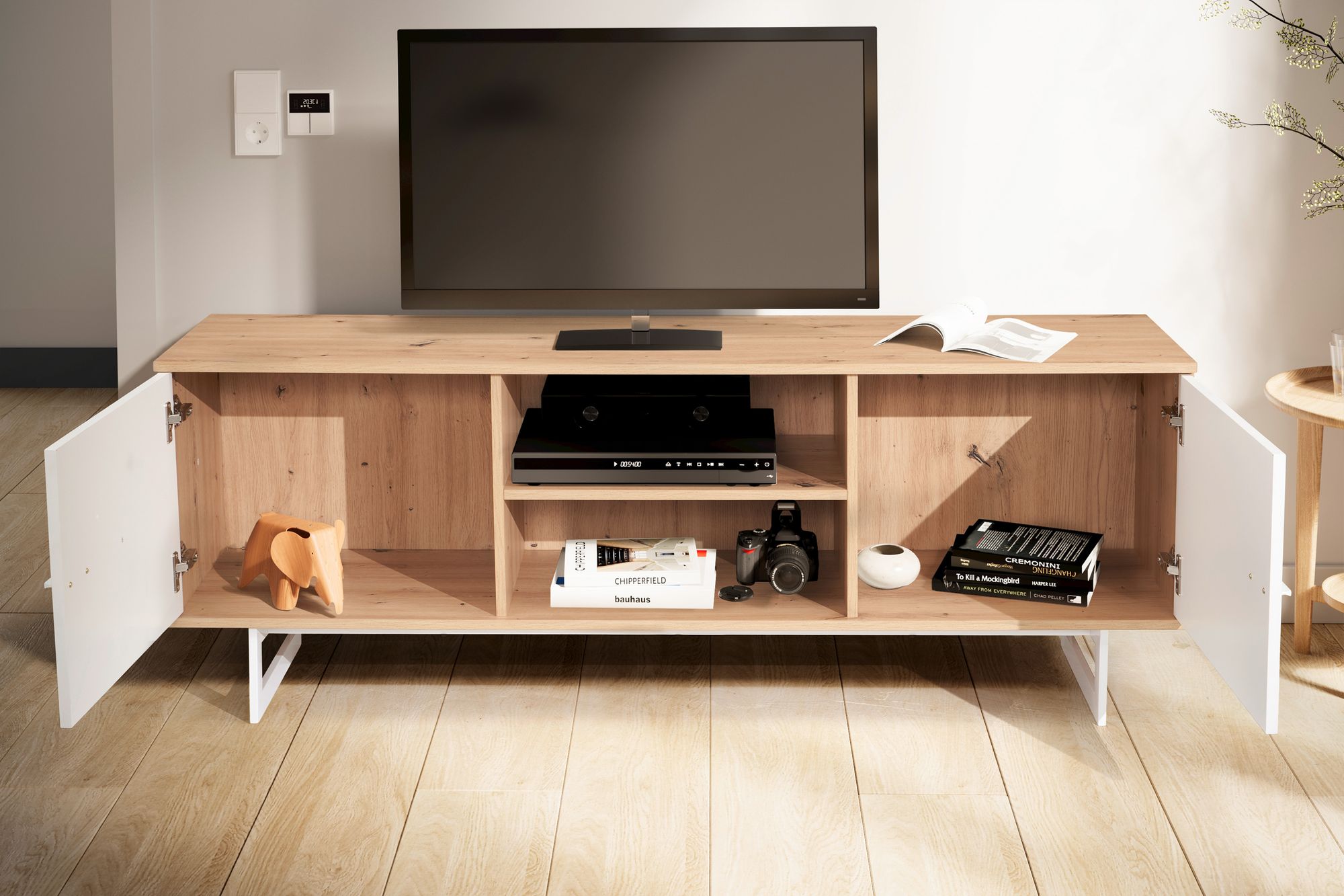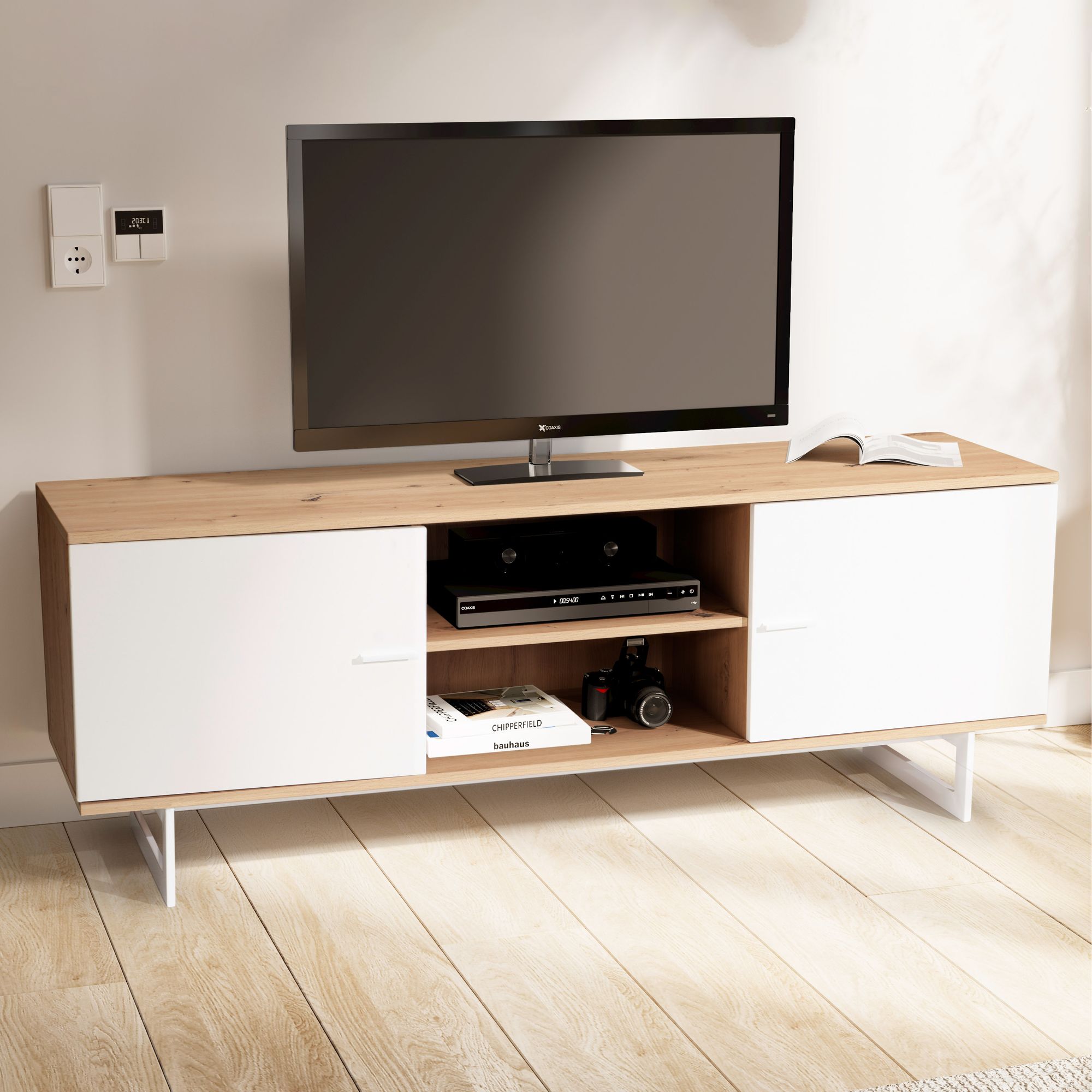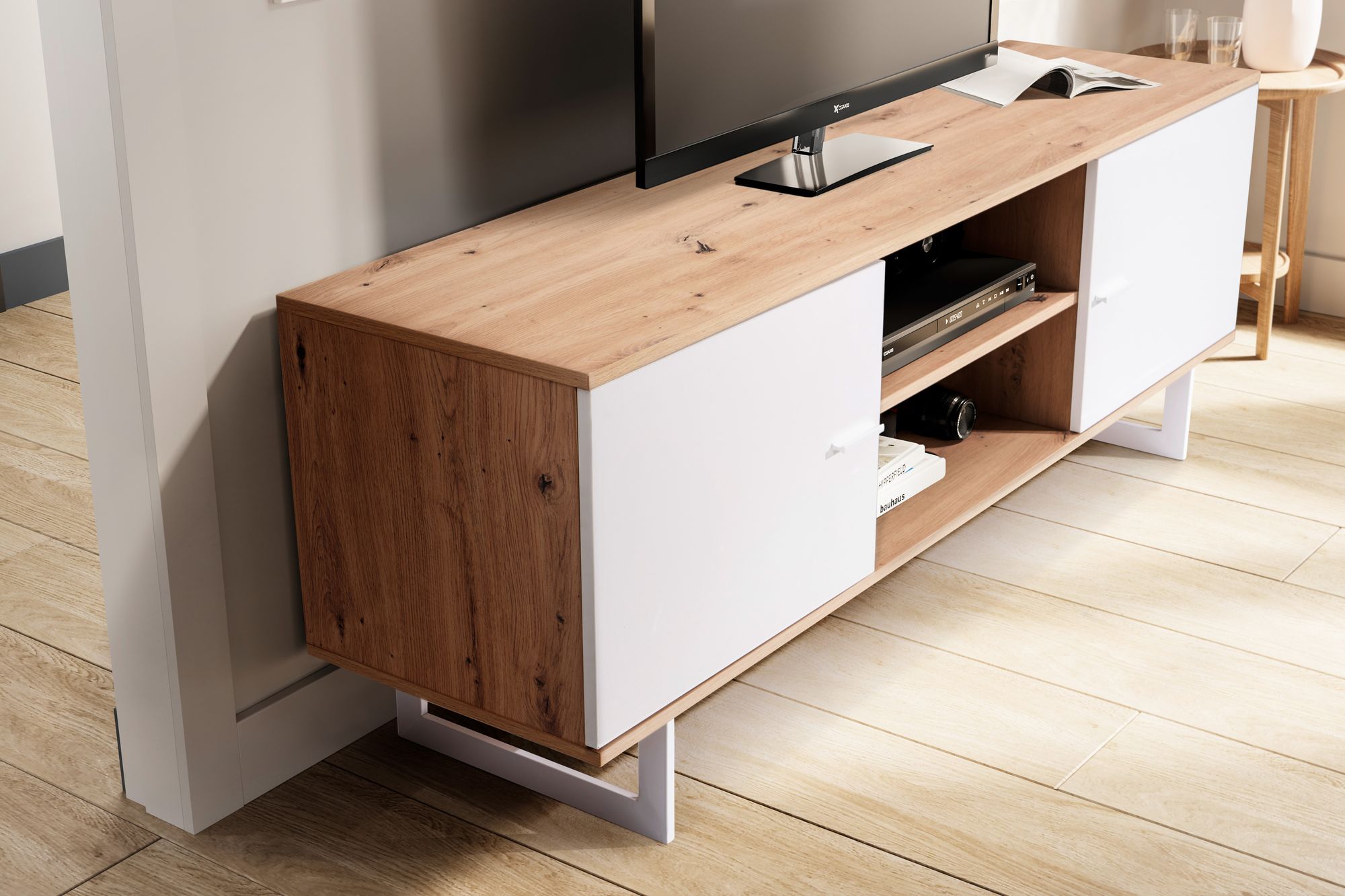 Nowoczesna szafka RTV łącząca jasny dekor dębowy z białymi drzwiami, uchwytami i nogami, oferująca jasny i czysty wygląd. Przestronny blat pomieści telewizory do 70 cali, a dwa drzwi i dwie otwarte półki zapewniają optymalne miejsce do przechowywania konsol, DVD i sprzętu multimedialnego.