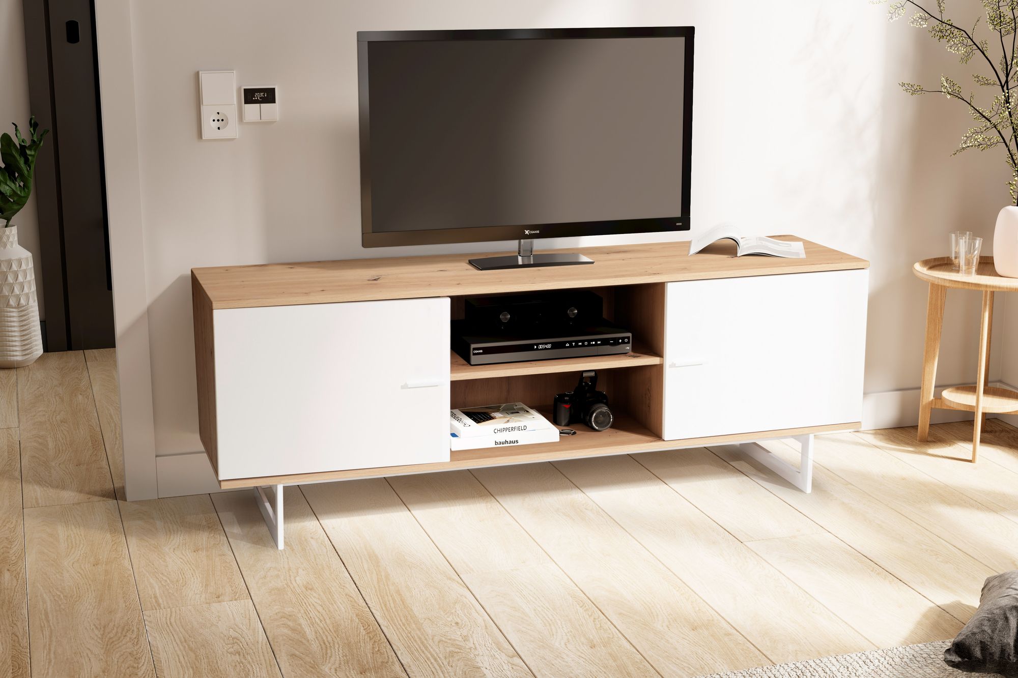 Lowboard dekor dębowy biały | 150x55x40 cm | Nowoczesna szafka RTV z dwoma drzwiami
