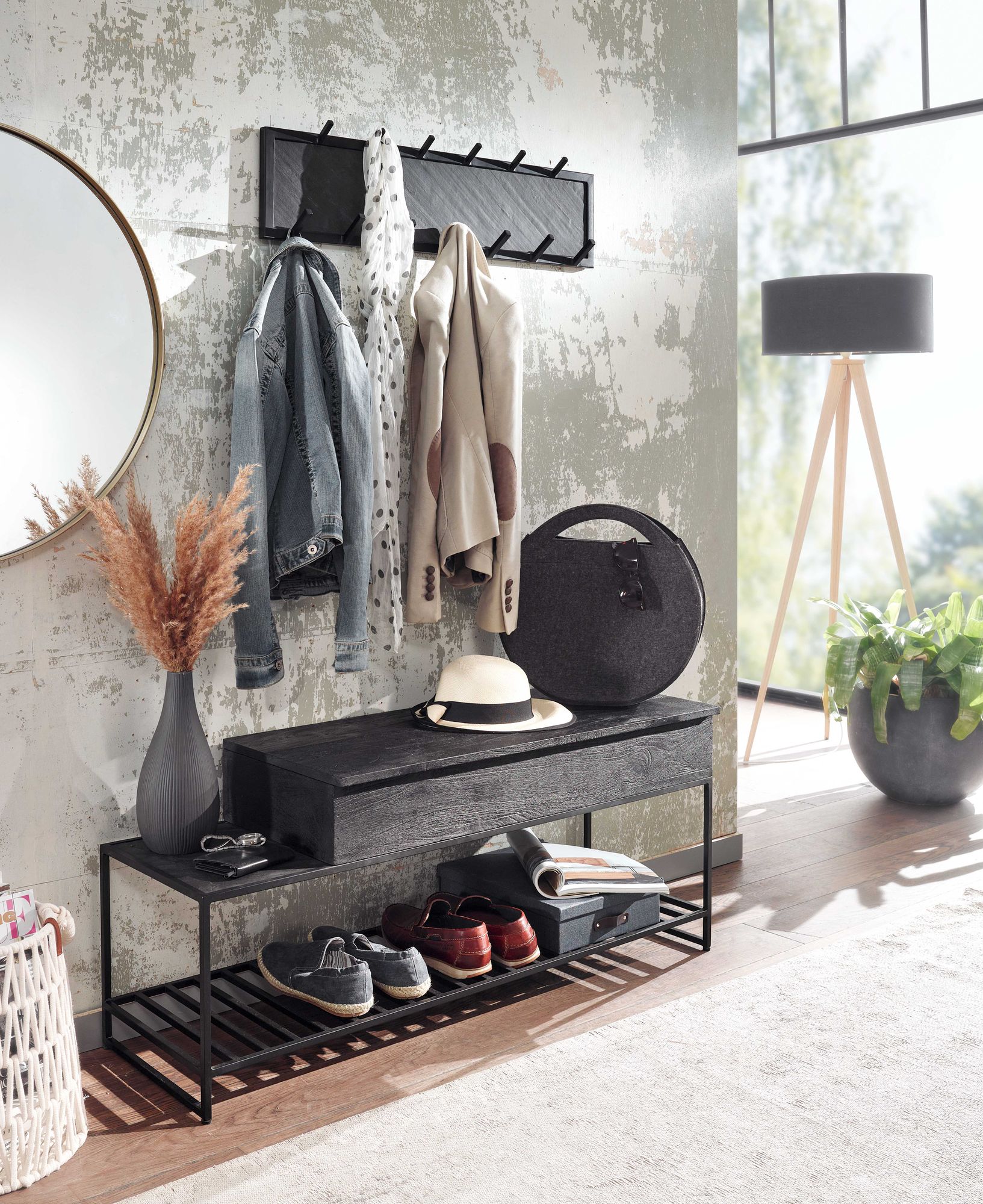 Ulepsz swoje wejście dzięki tej ławce z wieszakiem ściennym, wykonaną z litego czarnego drewna mango oraz proszkowo malowanego żelaznego stelaża w nowoczesnym stylu industrialnym. Zapewnia przestrzeń na buty i 13 mocnych haczyków na płaszcze i akcesoria.