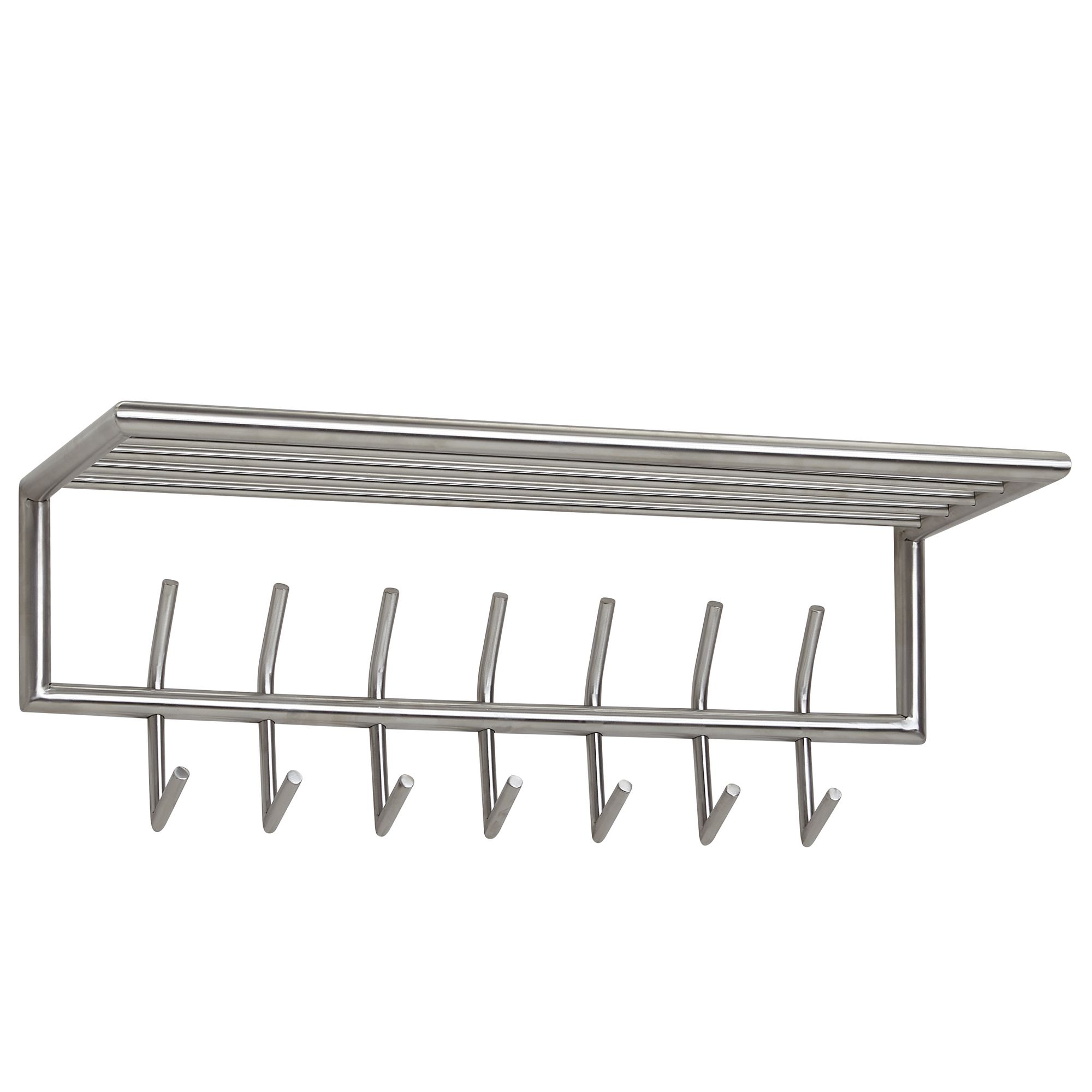 Ten srebrny, polerowany stalowy wieszak ścienny łączy elegancję z dużą pojemnością. Posiada 14 solidnych haczyków na dwóch wysokościach oraz praktyczną półkę na kapelusze, parasole i inne przedmioty.