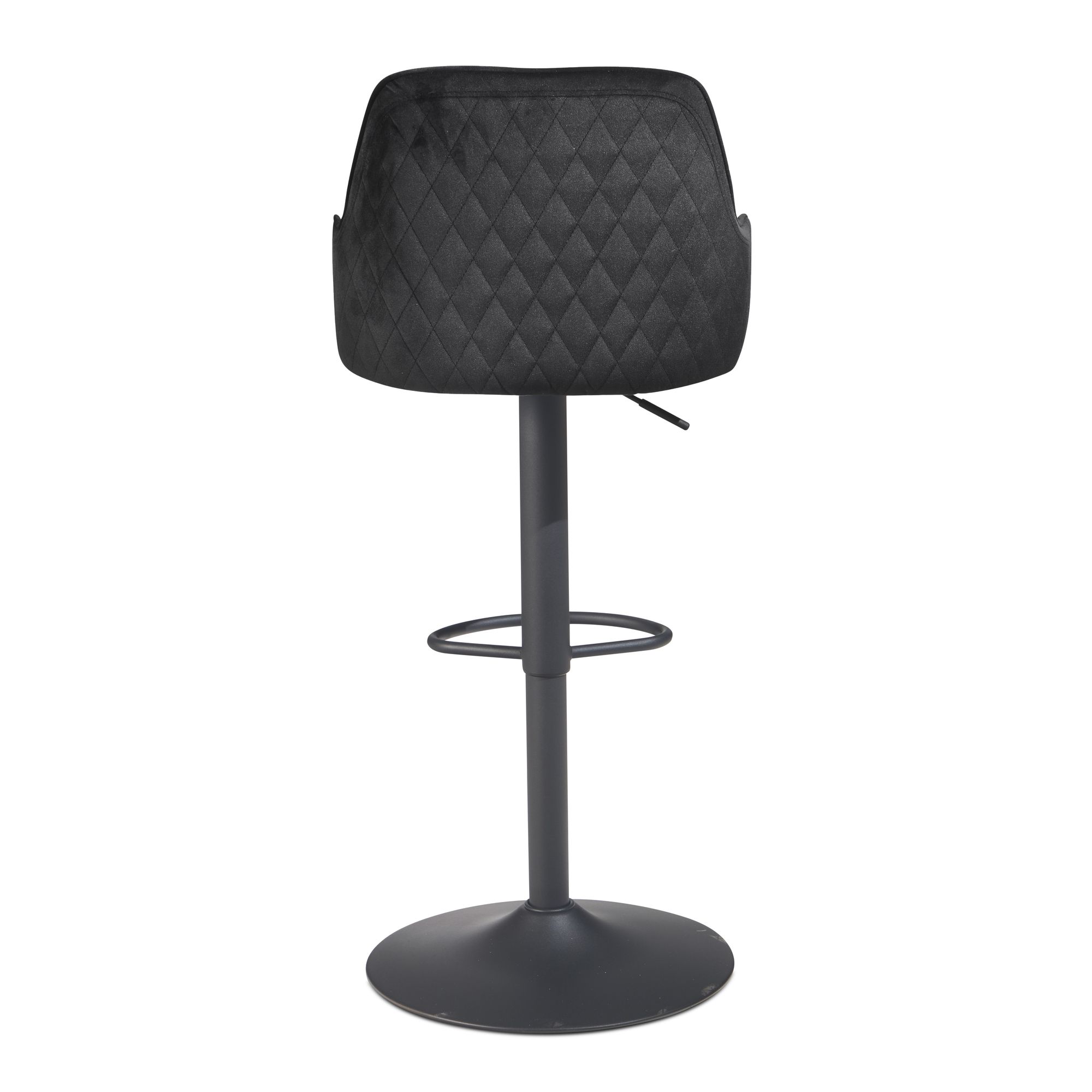 Nowoczesny hoker barowy z czarnego aksamitu z regulowaną wysokością od 86 do 106 cm. Ergonomiczne siedzisko z pikowaniem w kształcie diamentów na podłokietnikach i oparciu zapewnia doskonały komfort siedzenia. Metalowa podstawa typu trąbka gwarantuje stabilność i stylowy kontrast z miękkim aksamitem.