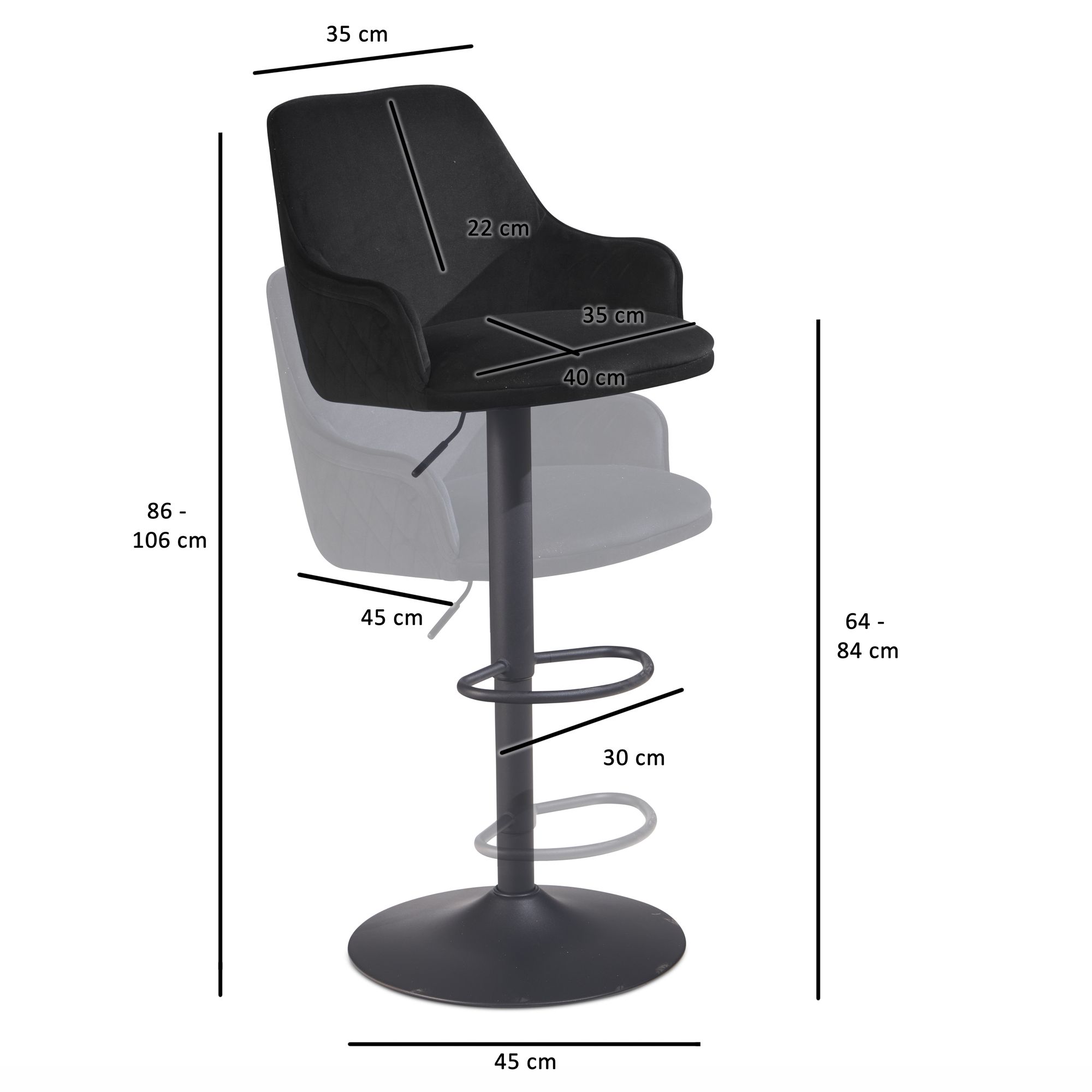 Informacje dot. produktu "Czarny aksamitny stołek barowy | Metalowa podstawa trąbkowa | Regulowana wysokość 86-106 cm"