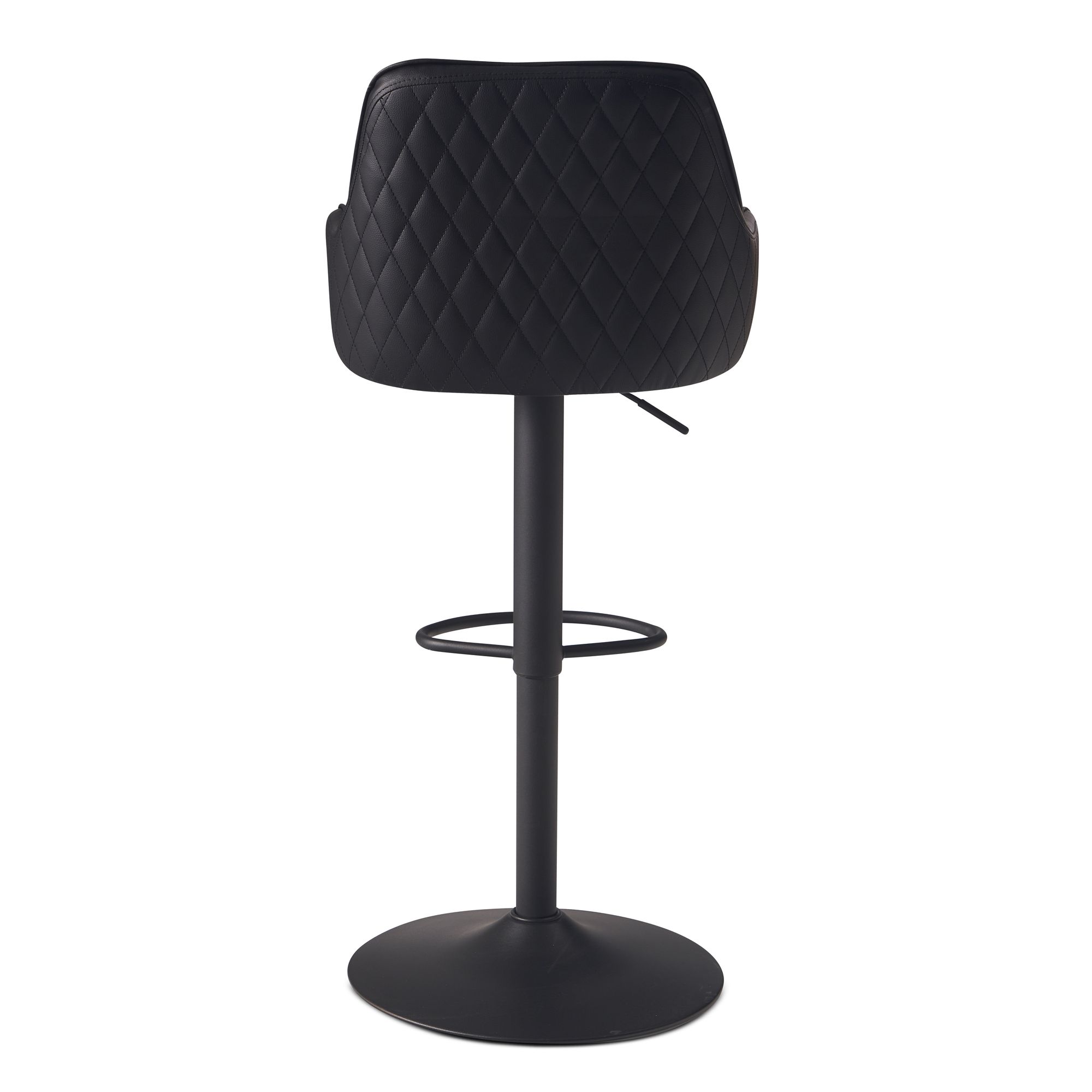 Czarny stołek barowy z ekoskóry łączy nowoczesny styl i praktyczność, posiada regulowaną wysokość od 86 do 106 cm. Ergonomiczna skorupa z pikowaniem w kształcie diamentów na podłokietnikach i oparciu zapewnia wygodne siedzenie. Metalowa podstawa typu trąbka zapewnia trwałość i elegancję.
